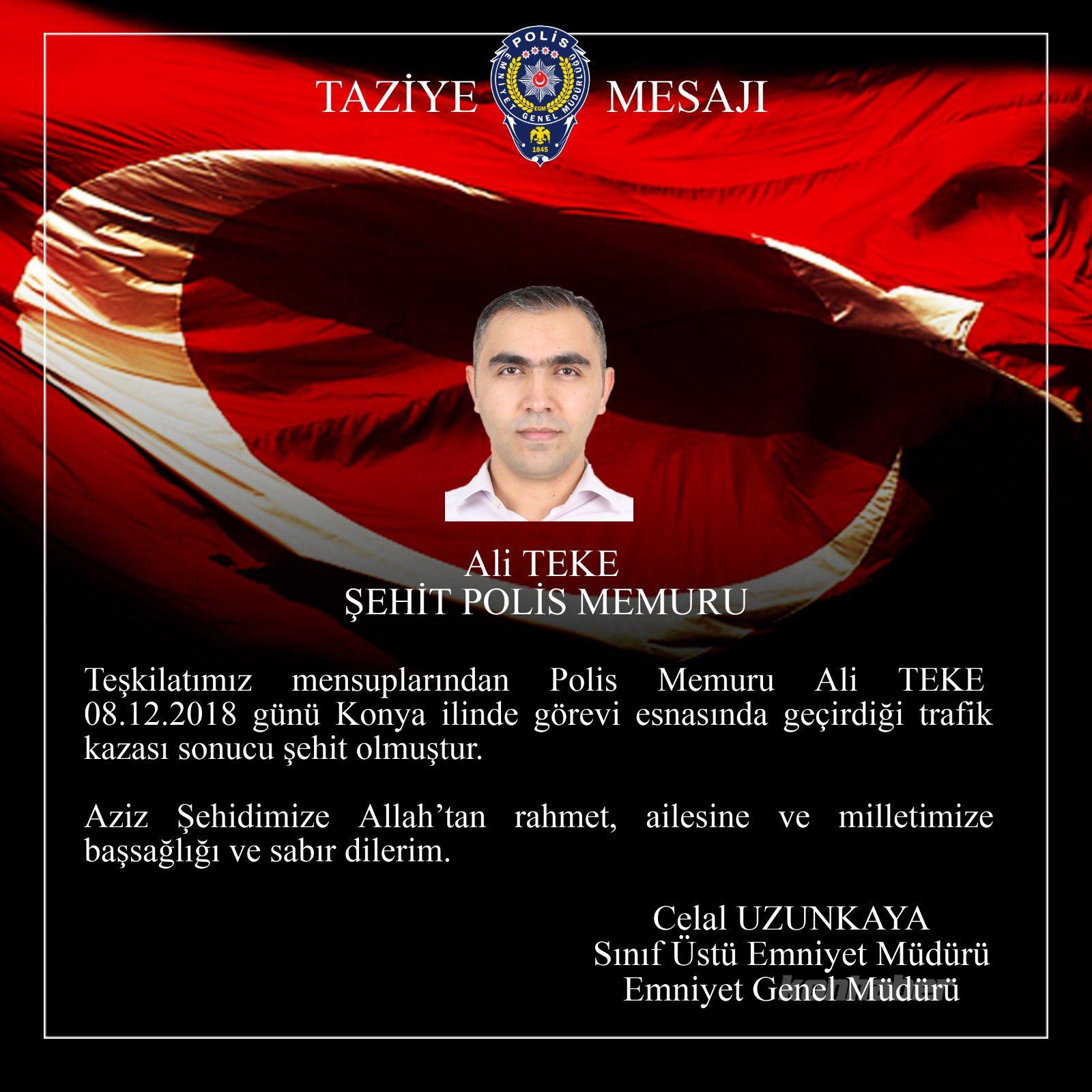 Kazanın adresi Fetih Caddesi ile Karakayış Caddesi´nin kesiştiği kavşak… Alkollü sürücünün kullandığı 42 FKG 63 plakalı otomobil polis otosuna çarptı. Çarpmanın şiddetiyle kontrolden çıkan polis aracı devrildi. Kazada 37 yaşındaki görevli Polis Memuru Ali Teke olay yerinde şehit oldu.BİNLER SON YOLCULUĞUNA UĞURLADI