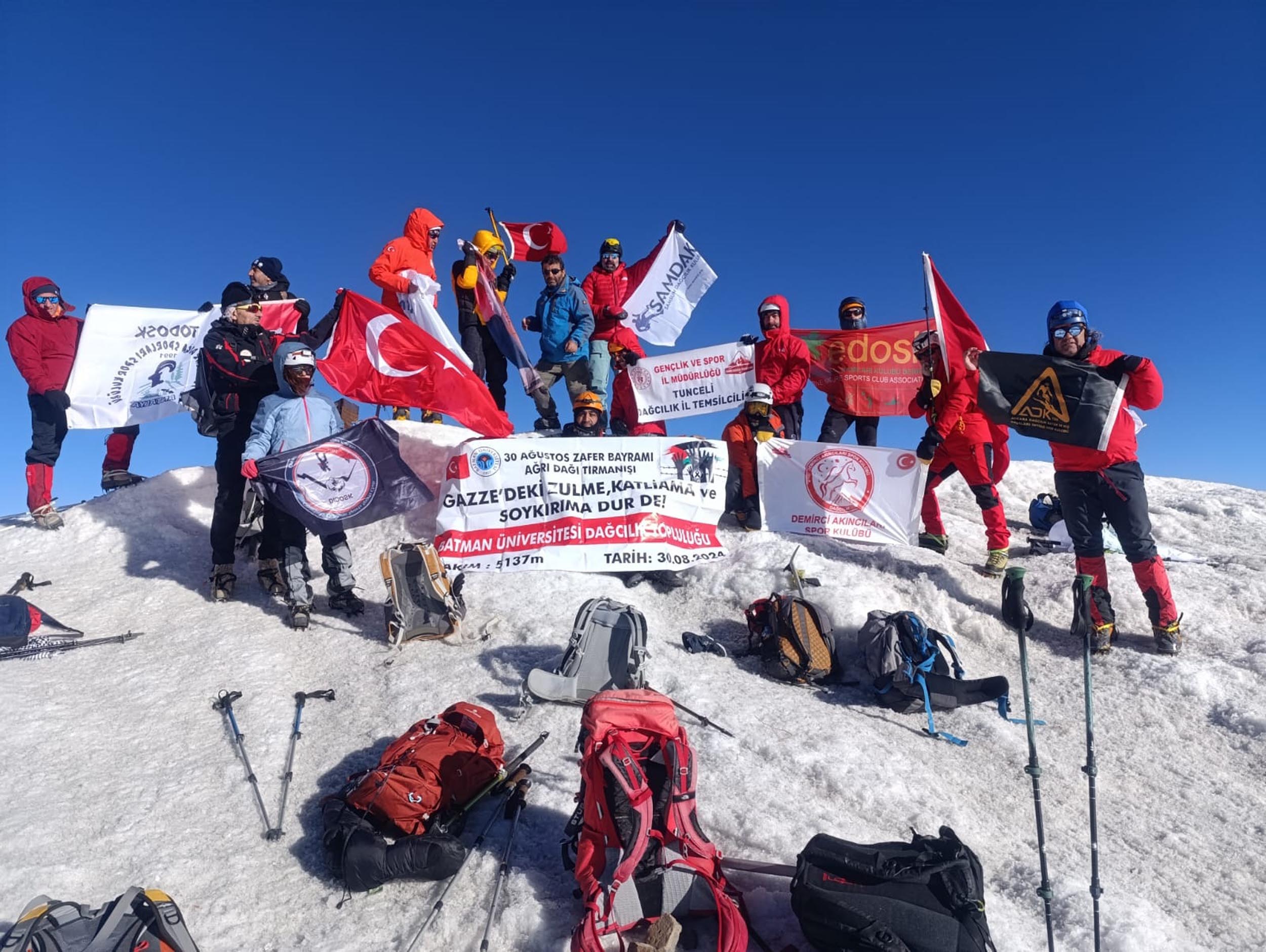 Yaklaşık 3,5 saat süren tırmanışın ardından bir süre mola veren dağcılar, saat 02.00 itibarıyla zirveye doğru yola çıktı. 7'si kadın 25 dağcı, 30 Ağustos sabahı 5137 metre yüksekliğindeki Ağrı Dağı'nın zirvesine ulaştı. Saat 07.30'da zirveye varan dağcılar, Atatürk posteri ile Türk bayrağı açarak, saygı duruşunda bulundu. İstiklal Marşı okuyan dağcılar, zirvede fotoğraf çekildikten sonra inişe geçti. Önce 4200 ardından 3200 kampına inen dağcılara, tırmanış sertifikası verildi. Dağcılar, daha sonra Doğubayazıt ilçesine döndü. Osman Kalaycıoğlu, tırmanışı Zafer Bayramı kutlamaları çerçevesinde yaptıklarını söyledi.