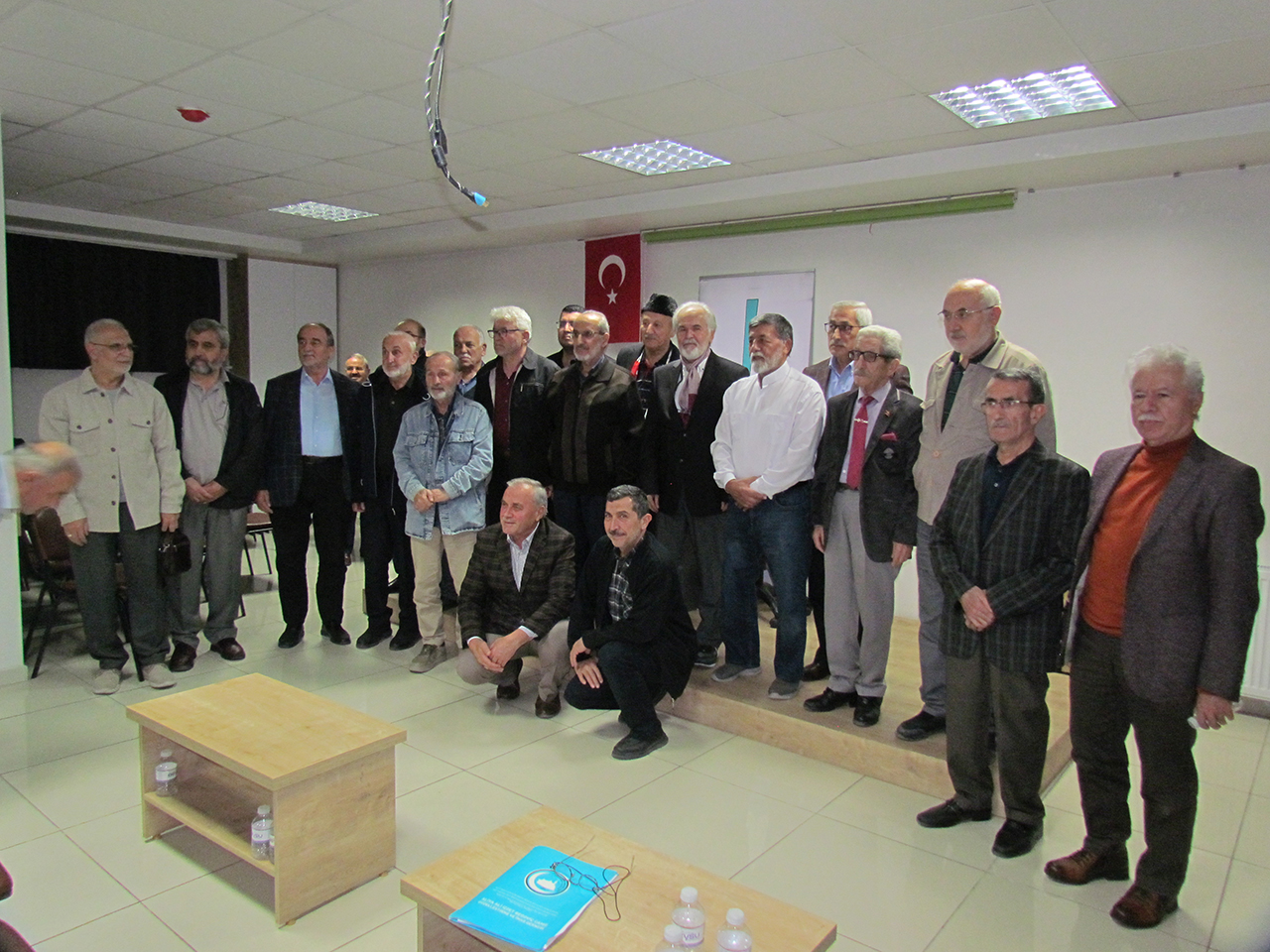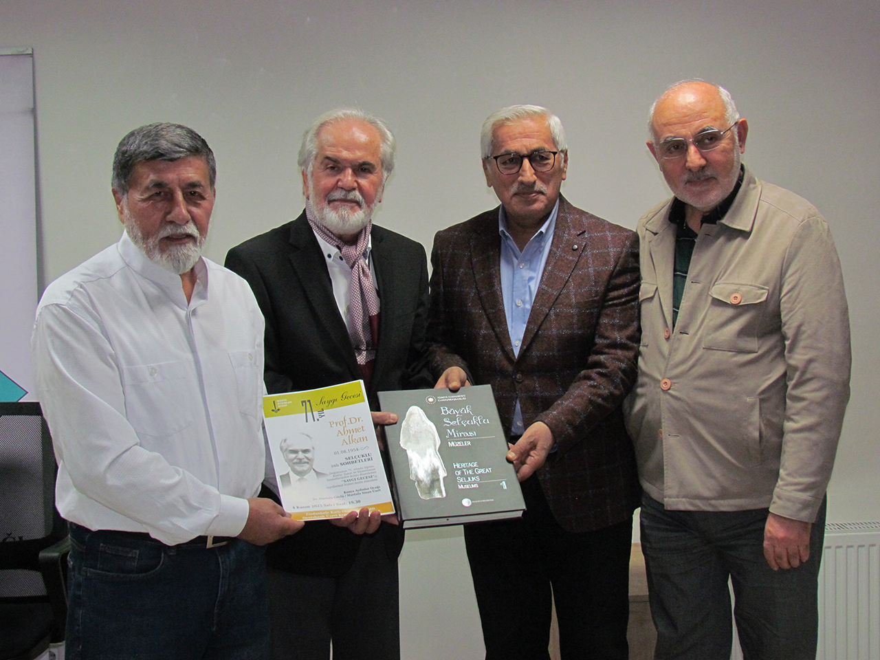 Program sonunda Prof. Dr. Ahmet Alkan’ın hediyesini Aydınlar Ocağı Başkanı Dr. Mustafa Güçlü Konya eski İl Kültür Müdürleri Abdüssettar Yarar ve Salih Sedat Ersöz ile birlikte takdim etti. (Veli Şengül)