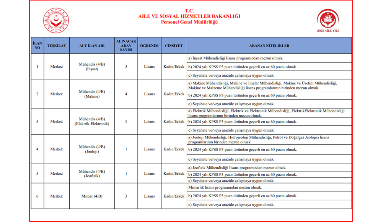 Peki, Aile ve Sosyal Hizmetler Bakanlığı’nın 3 bin kişilik personel alımına kimler başvurabilecek? Başvuru işlemleri hangi adımlarla yapılacak, adaylardan aranan genel ve özel şartlar neler? Alım yapılacak unvanlar ve kadro dağılımı hangi alanları kapsıyor? Başvuru sürecine dair tüm merak edilen detaylar kamuoyu ile paylaşıldı.