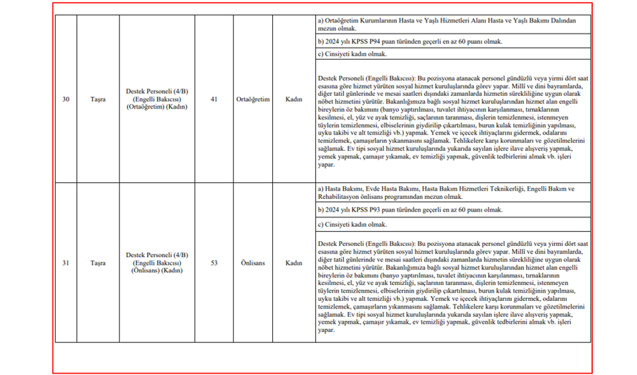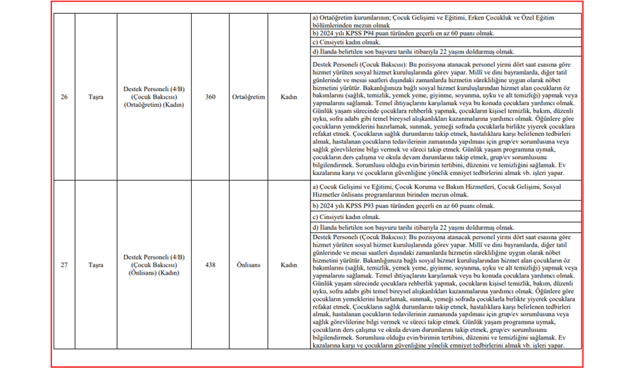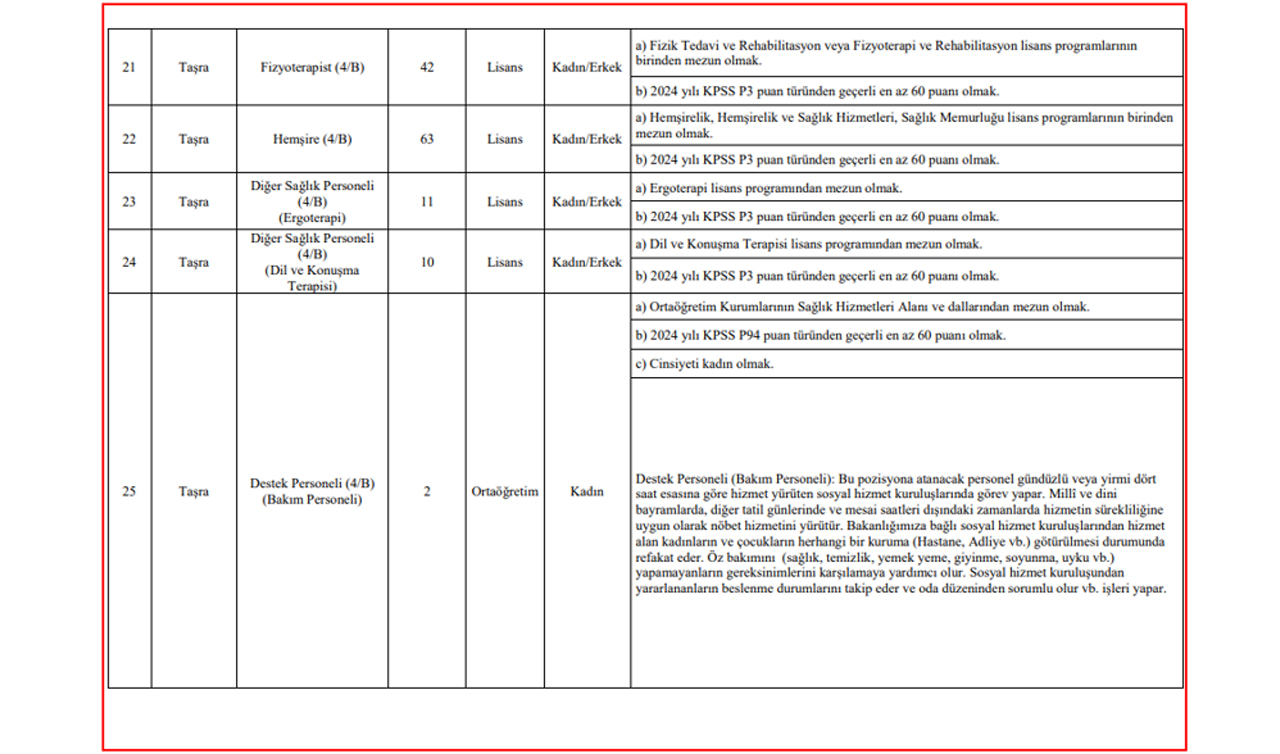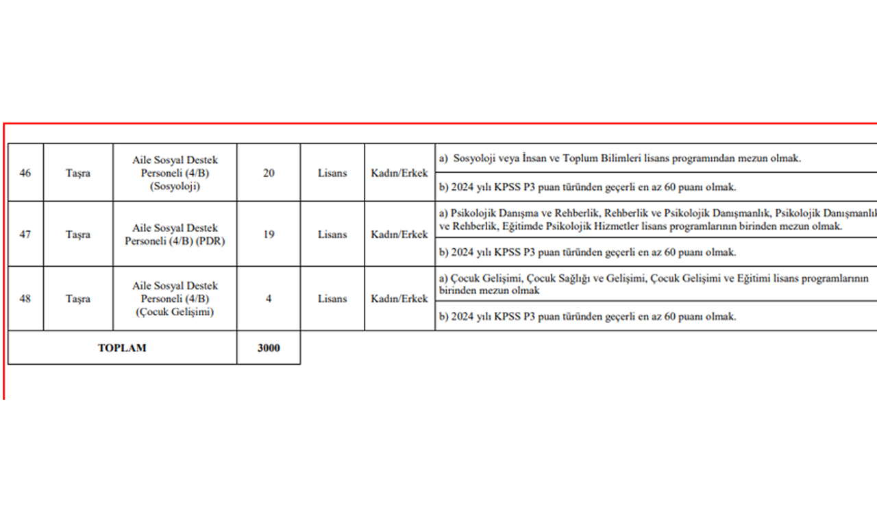 Aile ve Sosyal Hizmetler Bakanlığı 3 bin personel alımı başvuru şartları şu şekilde;
