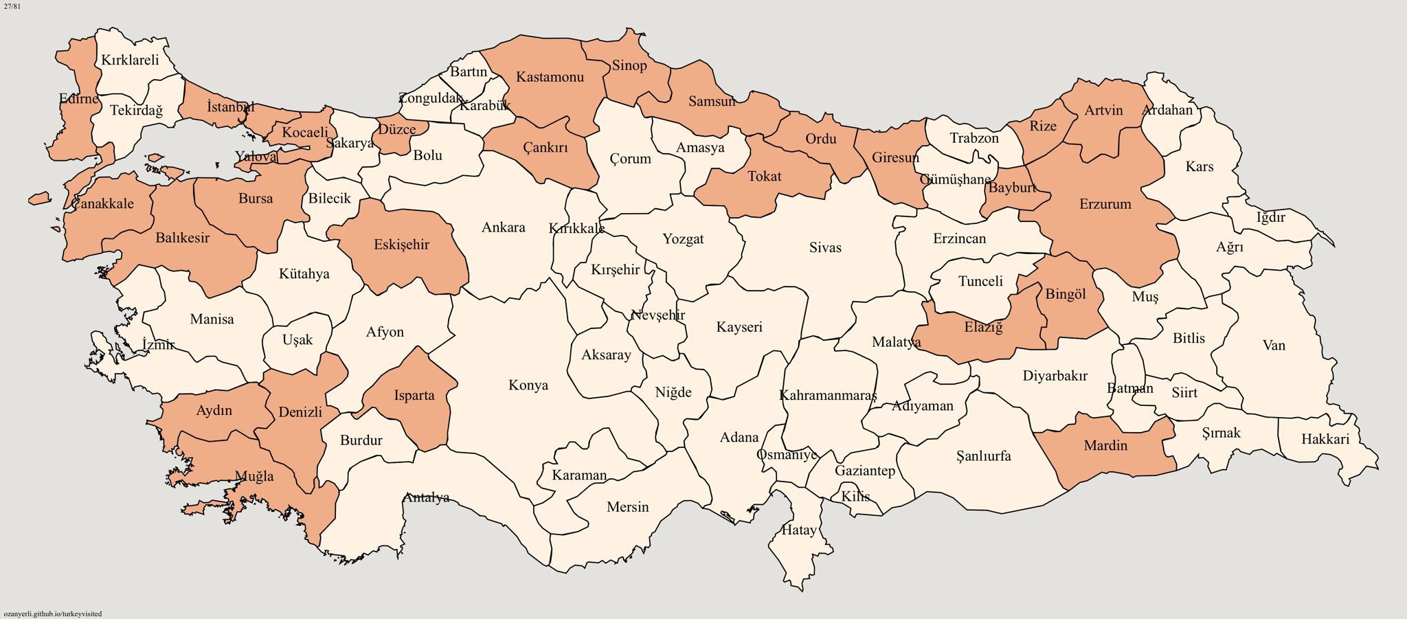 Edirne, Çanakkale, Balıkesir, Bursa, Yalova, Kocaeli, İstanbul, Aydın, Muğla, Denizli, Isparta, Eskişehir, Düzce, Kastamonu, Çankırı, Sinop, Samsun, Tokat, Ordu, Giresun, Rize, Bayburt, Artvin, Erzurum, Bingöl, Elazığ, Mardin.