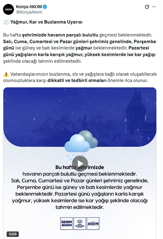 Konya Büyükşehir Belediyesi Afet Koordinasyon Merkezi (AKOM), kent genelinde etkili olması beklenen hava koşullarına karşı vatandaşları uyardı.