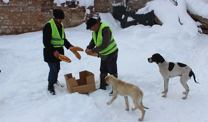 Konya’nın Akören ilçesinde etkili olan kar yağışı nedeniyle yiyecek bulmakta zorlanan sokak hayvanları için çalışmalar devam ediyor.