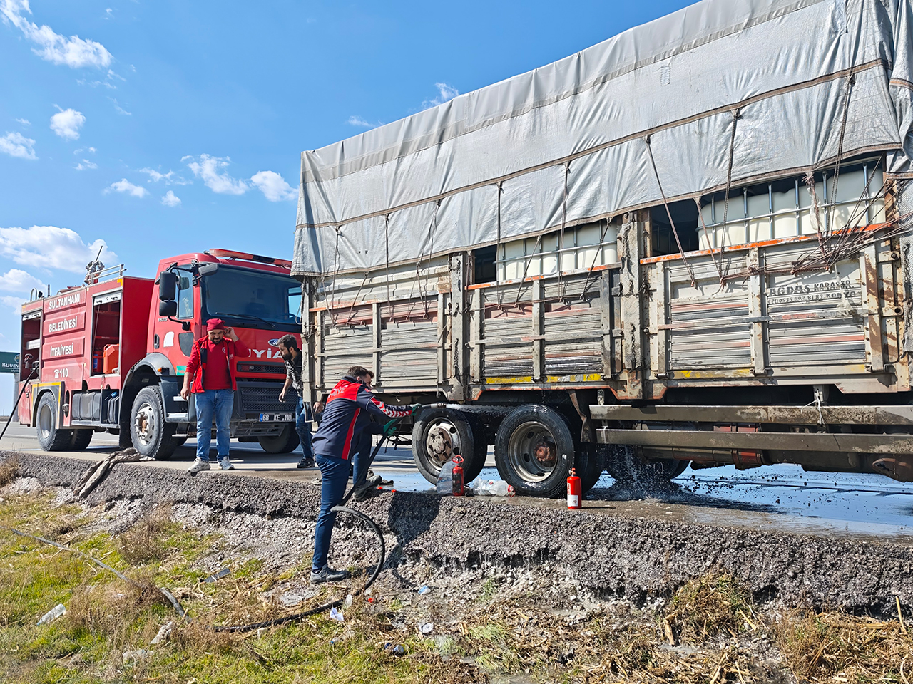 Önce dumanları sonra da alevi fark eden kamyon sürücüsü aracı hemen sağa çekerek bir yandan su dökerek alevlere müdahale etti öte yandan 112 Acil Çağrı Merkezini arayarak yardım istedi.