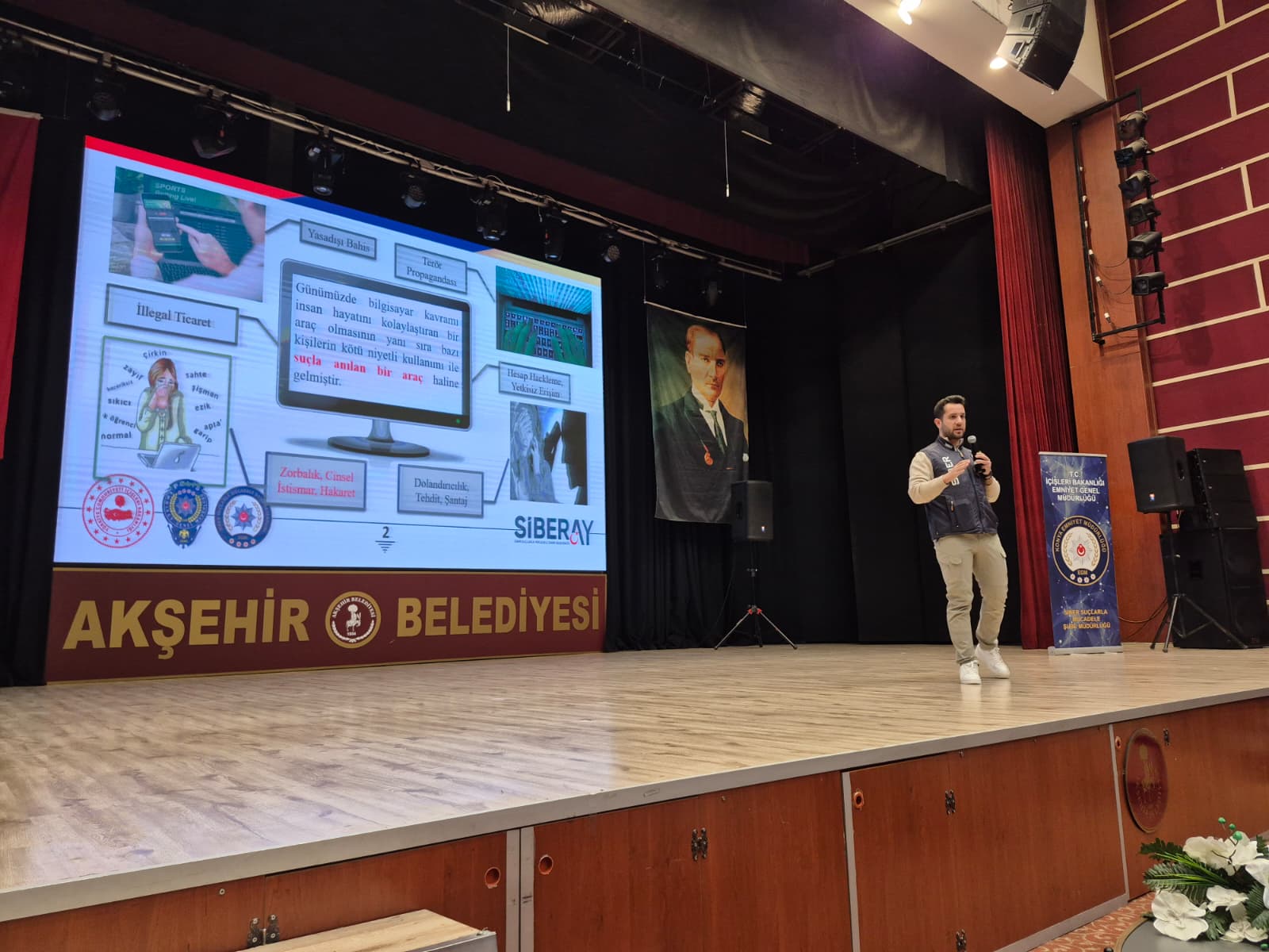 Konya Emniyet Müdürlüğü Siber Suçlarla Mücadele Şube Müdürlüğü ile Akşehir Emniyet Müdürlüğü iş birliğinde hazırlanan "Siber Farkındalık Semineri" programı, Akşehir’de farklı yaş ve meslek gruplarına yönelik olarak gerçekleştiriliyor.