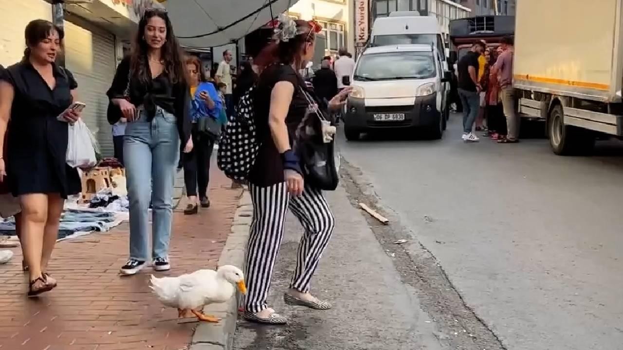 Gülbahar Mahallesi'ndeki semt pazarında alışveriş yapan bir kadının peşi sıra giden ördeği gören vatandaşlar şaşkınlığını gizleyemiyor.