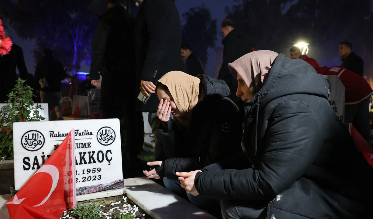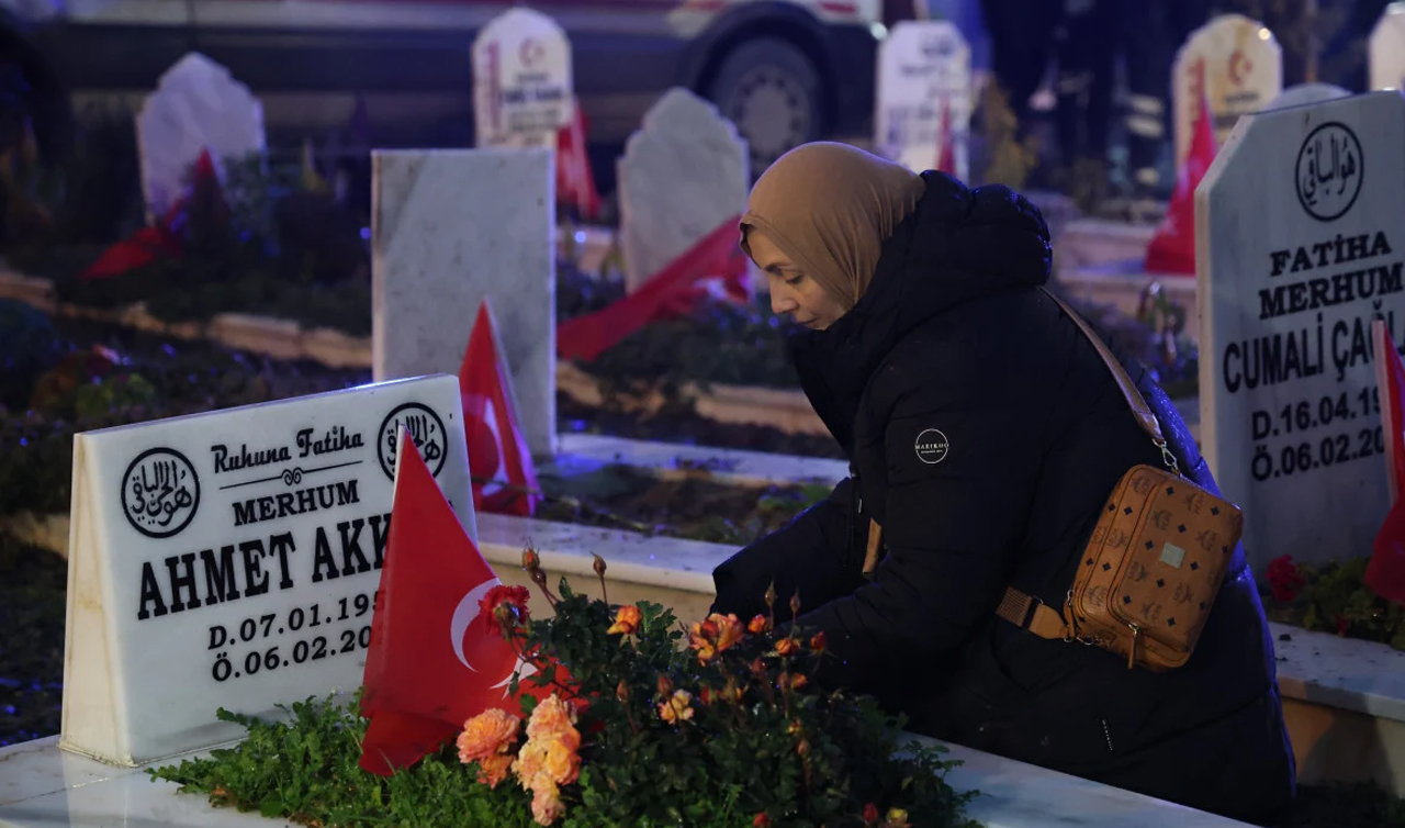 Almanya’dan gelen Türkan Akkoç, depremin ikinci yıl dönümde ailesinin kabrine gelerek gözyaşlarına boğuldu.