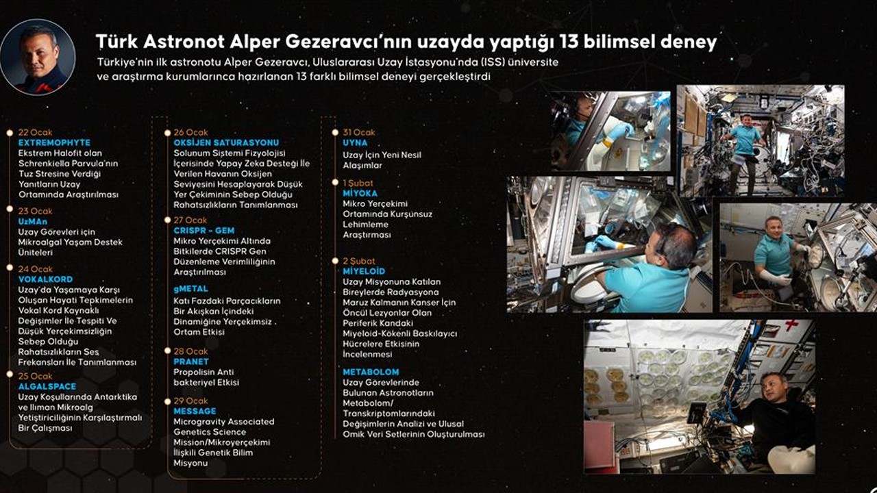 Türkiye'nin ilk astronotu Alper Gezeravcı, uzay koşullarının insan sağlığı üzerindeki etkilerini ortaya çıkarmayı amaçlayan "METABOLOM" isimli deneyiyle Uluslararası Uzay İstasyonu'ndaki (ISS) son bilimsel çalışmasını gerçekleştirdi.