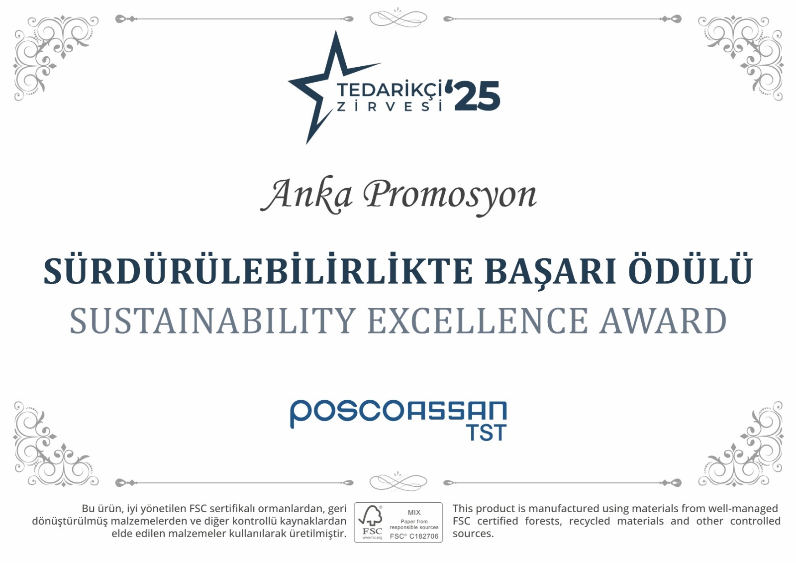 Anka Promosyon, POSCO Assan TST ev sahipliğinde gerçekleştirilen Tedarikçi Zirvesi ’25 kapsamında, sürdürülebilirlik alanındaki çalışmalarıyla “Sürdürülebilirlikte Başarı Ödülü (Sustainability Excellence Award)” almaya hak kazandı.
