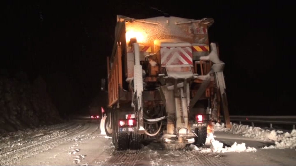 Akseki-Seydişehir karayolu 1825 metre rakımlı Alacabel'de kar yağışı sabah saatlerine kadar etkisini sürdürürken, Karayolları ekipleri çok sayıda iş makinası ile kar temizleme ve tuzlama çalışmaları başlattı.