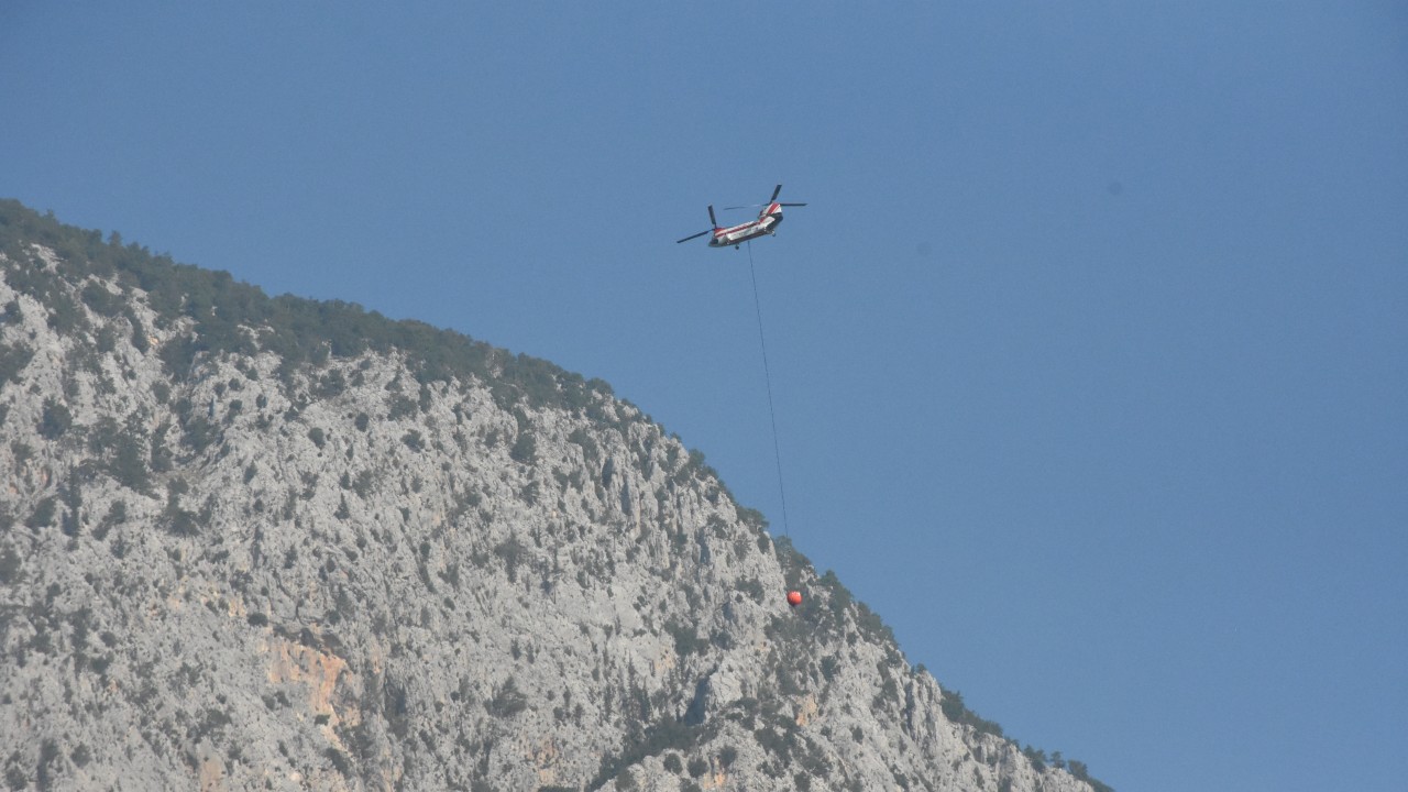 Bölgede görev yapan helikopterler, denizden aldıkları suyu yanan alanlara taşıyarak söndürme çalışmalarına destek veriyor.