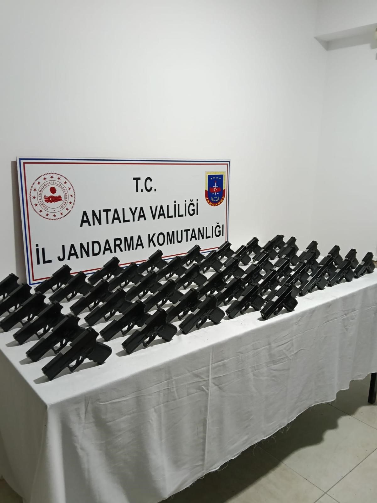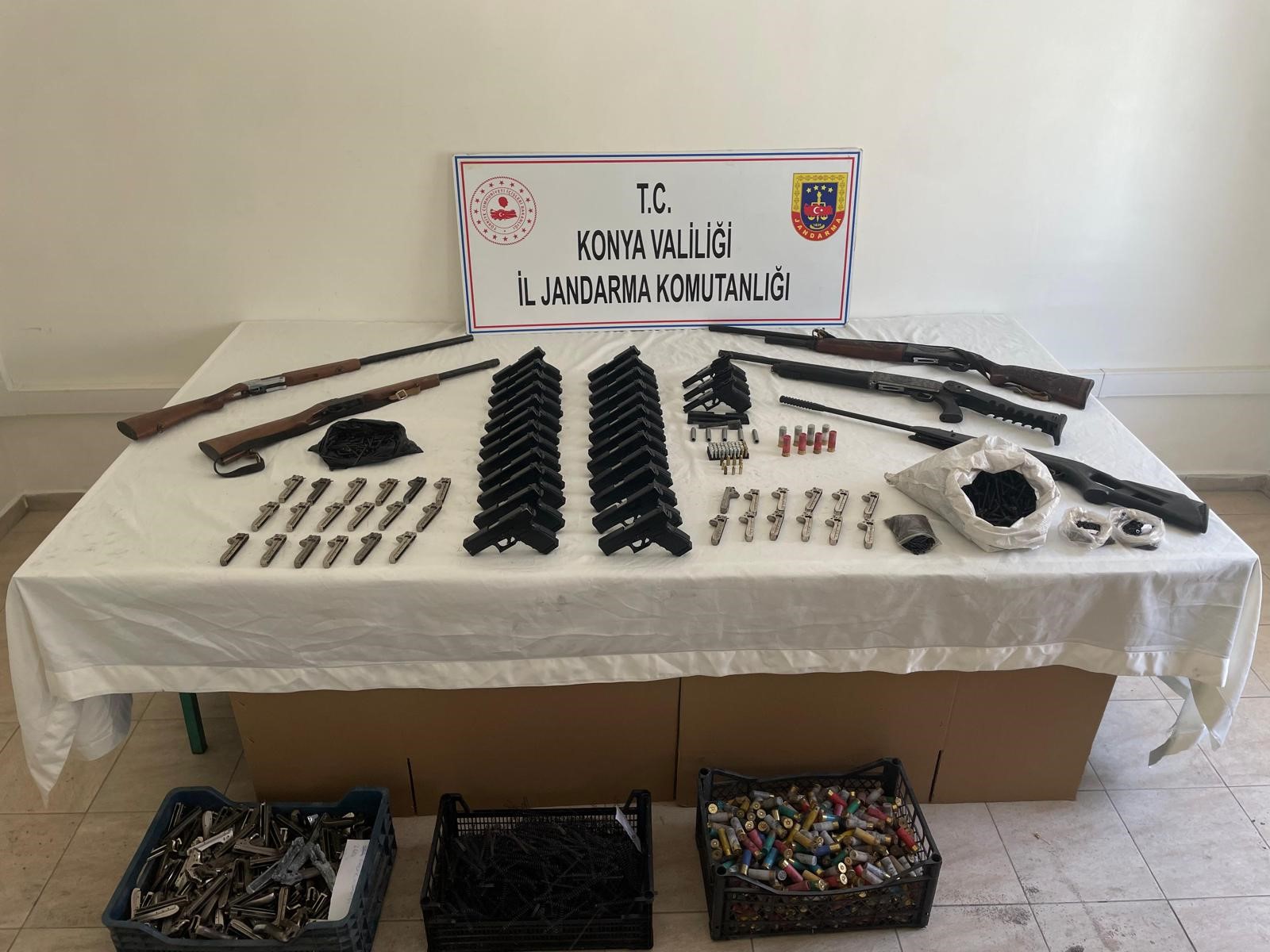 Soruşturma çerçevesinde İl Jandarma Komutanlığı Kaçakçılık ve Organize Suçlarla Mücadele Şube Müdürlüğü ekipleri tarafından yapılan araştırma sonucunda Mehmet E., Kadir T., Raşit B., Ali Han Ö. ve İbrahim Ö.'nün Antalya'nın Manavgat ilçesi ve Konya'nın Beyşehir ilçesinde bulunan işyeri, ev ve ikamet eklentilerinde yapılan arama sonucunda; 49 markasız ruhsatsız tabanca gövdesi, 49 markasız ruhsatsız tabanca üst kapağı, 49 markasız ruhsatsız tabanca namlusu, 49 markasız ruhsatsız tabanca yerine getiren yay ve mili, 24 ruhsatsız, seri numarasız 9 mm. tabanca, 3 seri numaralı, markalı, ruhsatsız av tüfeği, 1 seri numarasız, markasız av tüfeği, 1 markasız 5.5 mm havalı tüfek, 54 tane 9 mm tabanca fişeği, 5 tane 7.65 mm tabanca fişeği, 28 tabanca şarjörü, bin 681 av tüfeği fişeği, 5 bin 756 muhtelif tabanca parçası, 1 cep telefonu ile 1 tablet ele geçirildi. Jandarmadaki işlemlerinin ardından savcılığa sevk edilen 5 şüpheli şahıs çıkarıldıkları sulh ceza hakimi tarafından tutuklandı.