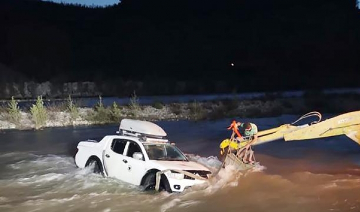 Bu sırada aracıyla dere yatağının karşısına geçmeye çalışan Veysel Durusoy suda mahsur kaldı.