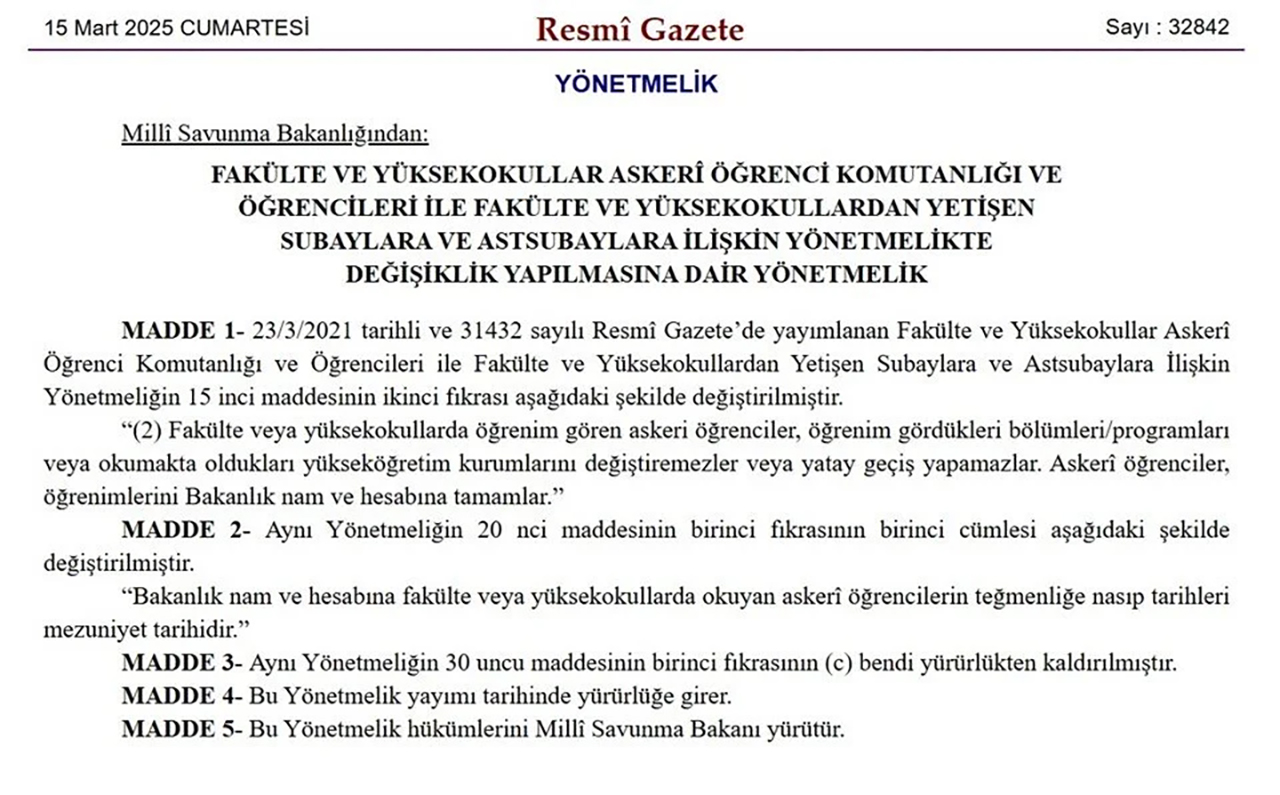 Resmi Gazete'de yayımlanan yönetmelik değişikliğine göre, fakülte ve yüksekokullarda öğrenim gören askeri öğrenciler artık başka üniversitelere yatay geçiş yapamayacak ve bölümlerini değiştiremeyecek.