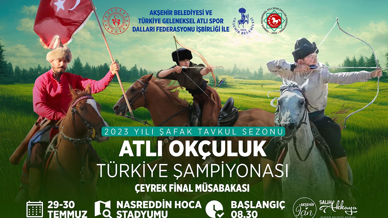 Akşehir Belediyesi ve Türkiye Geleneksel Atlı Spor Dalları Federasyonu İşbirliği ile 2023 Yılı Şafak Tavkul Sezonu Atlı Okçuluk Türkiye Şampiyonası Çeyrek Final Müsabakaları Akşehir’de gerçekleştirilecek.