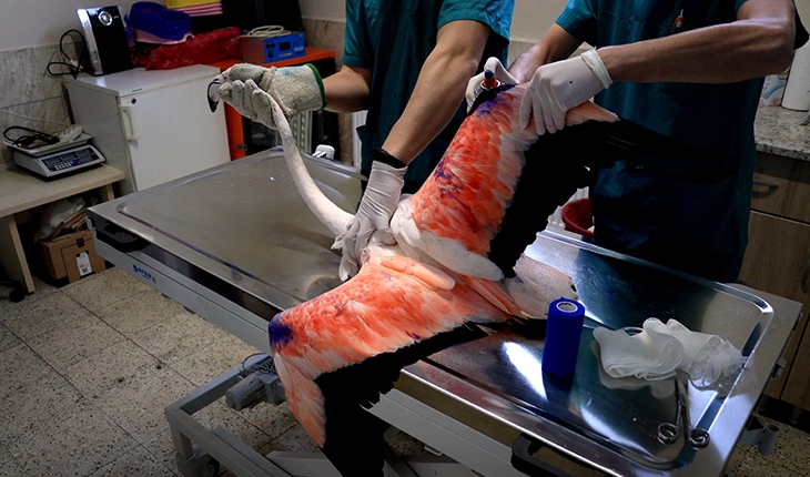 Avcıların tüfekle yaraladığı ve uçma yetisini kaybeden flamingonun 15 saçma isabet eden kanadı ameliyat edildi. Yapılan operasyonla flamingonun kanadında bulunan saçmalar çıkarıldı.