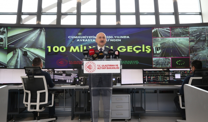 Karaismailoğlu, bugün itibarıyla Avrasya Tüneli'ni tam 100 milyon aracın kullandığını ve bunun haklı gururunu ve mutluluğunu paylaştıklarını ifade ederek, "6 yıldır vatandaşlarımızın yolunu ve seyahat süresini kısaltan, güvenliğini ve konforunu artıran dünyanın en önemli mühendislik projelerinden biri olan Avrasya Tüneli İstanbul'a, ülkemize uzun yıllar hizmet etmeye devam edecektir." dedi.