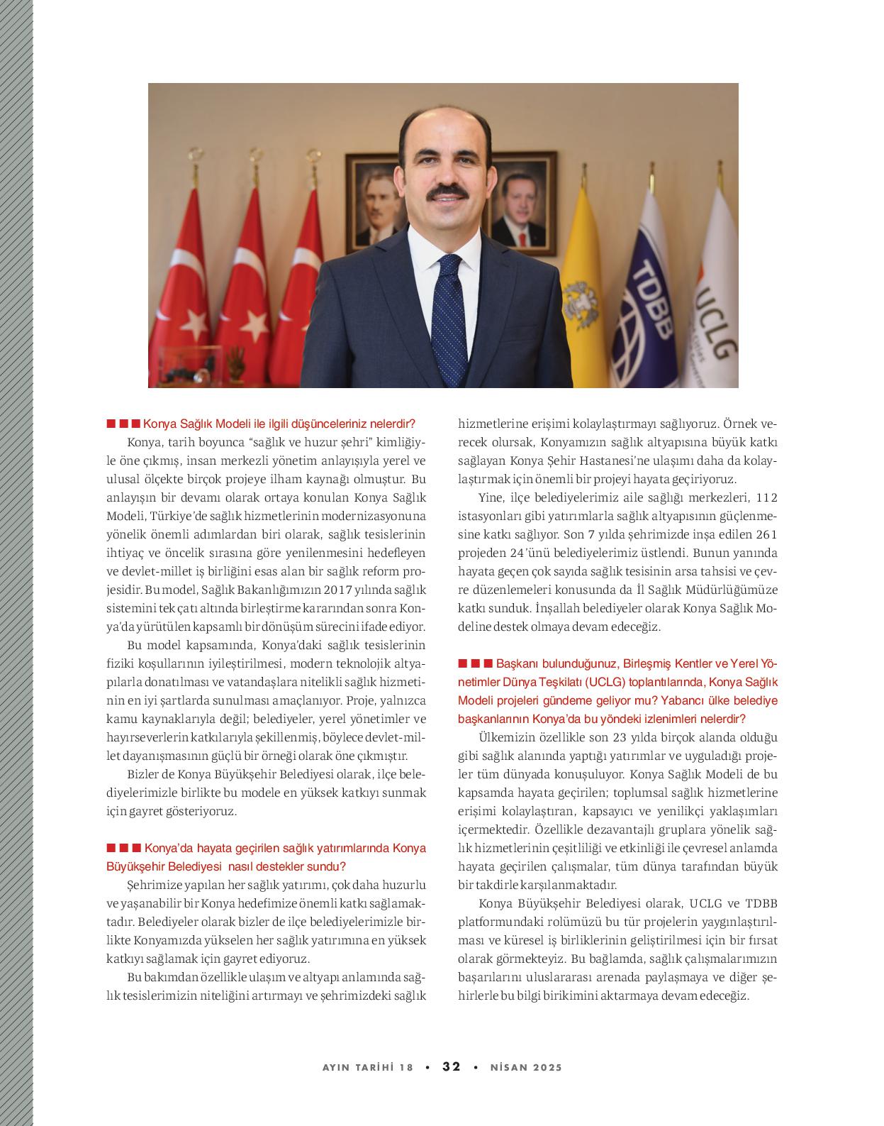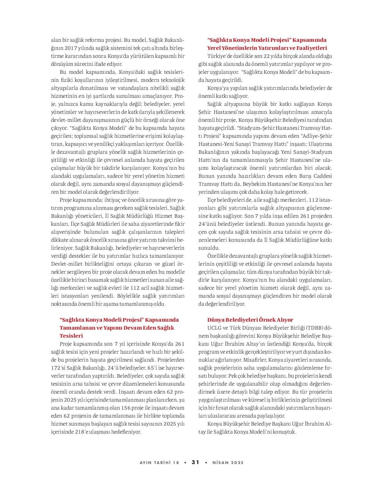 ‘Sağlıkta Konya Modeli’, Türkiye’de sağlık hizmetlerinin modernizasyonuna yönelik önemli adımlardan biri olarak, sağlık tesislerinin ihtiyaç ve öncelik sırasına göre yenilenmesini hedefleyen ve devlet-millet iş birliğini esas alan bir sağlık reformu projesi olarak gösterilmekte. Dergide, ayrıca Konya Büyükşehir Belediye Başkanı Uğur İbrahim Altay’la gerçekleştirilen bir röportaja da yer verilerek, sağlık tesislerinin inşası, altyapı çalışmaları, arazi tahsisi, yol yapım çalışmaları ve teknik donanım temini başta olmak üzere birçok yatırımın hayata geçirilmesinde Konya Büyükşehir Belediyesi ve İlçe Belediyelerinin sundukları önemli katkılar kamuoyuyla paylaşılmakta.