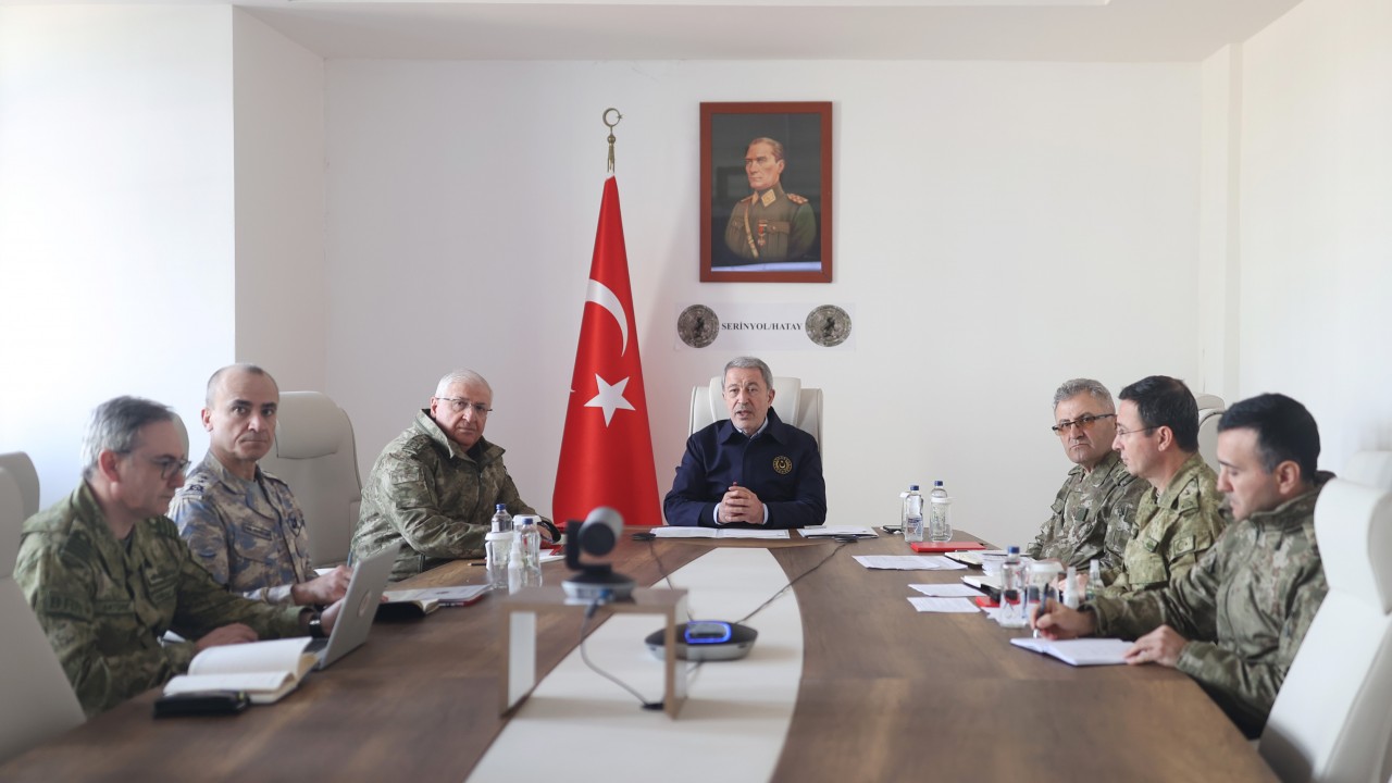 Bakan Akar’ın beraberindeki Genelkurmay Başkanı Orgeneral Yaşar Güler ile depremin hemen ardından geldiği ve Mehmetçiğin bölgedeki nöbet, devriye, arama kurtarma ile yaşam destek faaliyetlerini ilk günden itibaren yerinde takip ettiği Hatay’ın Serinyol ilçesindeki 8. Komando Tugay Komutanlığından katıldığı toplantı sırasında, Kara Kuvvetleri Komutanı Orgeneral Musa Avsever, Deniz Kuvvetleri Komutanı Oramiral Ercüment Tatlıoğlu, Hava Kuvvetleri Komutanı Orgeneral Atilla Gülan, karargahlarının harekat merkezlerinde depremin hemen ardından oluşturulan Afet Acil Durum Kriz Merkezlerinde, Bakan Yardımcısı Karaosmanoğlu ise Bakanlığın Afet Acil Durum Kriz Merkezinde hazır bulundu.Deprem bölgesindeki birliklerin komutanlarının da katıldığı toplantıda Bakan Akar, sahadaki son durum ve çalışmalara ilişkin bilgi aldı.