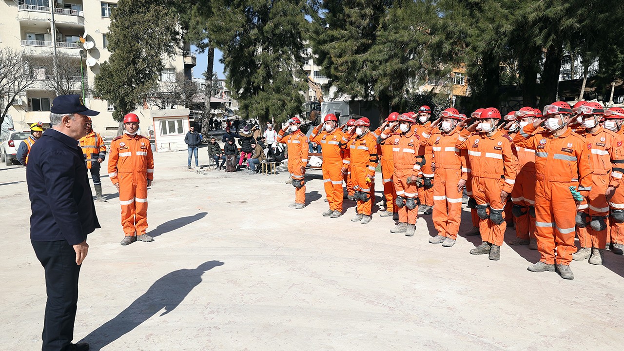 "Büyük fedakarlık ve kahramanlık gösterdiniz"Depremin ardından 24 kişiyi enkaz altından canlı olarak kurtaran personeli kahramanlıkları ve fedakarlıklarından dolayı tebrik eden Akar, “Büyük fedakarlık ve kahramanlık gösterdiniz. Tüm zorluklara rağmen ilk andan itibaren halkımızın yanına koştunuz. Alınlarınızdan öpüyor, sizleri kutluyorum” dedi.