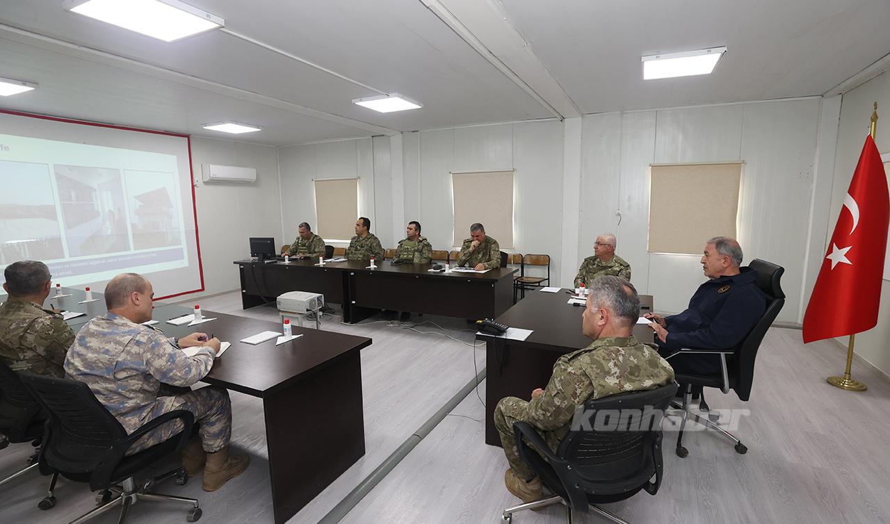 Suriye'nin kuzeyindeki Bahar Kalkanı ve Zeytin Dalı harekat bölgelerinin desteklendiği Kumlu Üs Bölgesi'ne giderek inceleme ve denetlemelerde bulunan Akar, komutanlık binasında brifing aldı.