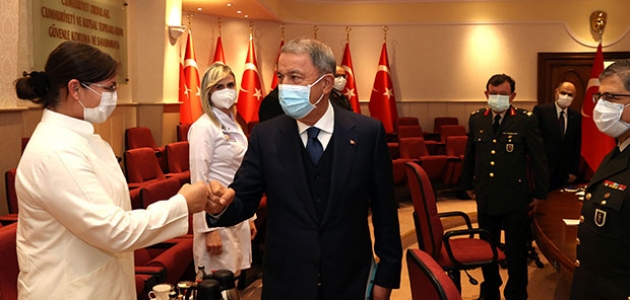 Bakanlığın sosyal medya hesabından yapılan paylaşımda Akar, Milli Savunma Bakanlığında bir araya geldiği sağlık çalışanlarının bayramını kutladı.