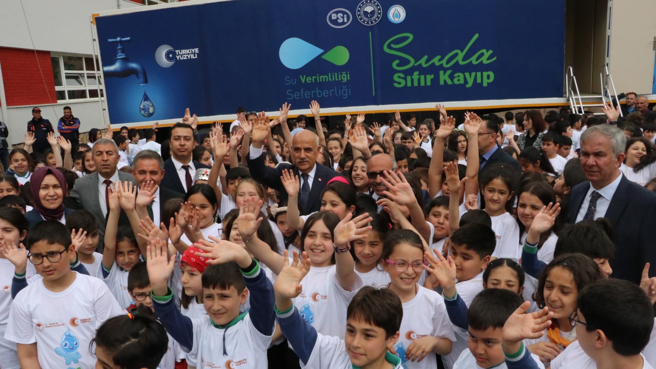 Bakan Kirişci, konuşmasının ardından Türkiye'yi dolaşacak "Suda Sıfır Kayıp Tırı"nı inceledi ve öğrencilere su verimliliği ile ilgili bilgiler paylaştı.
