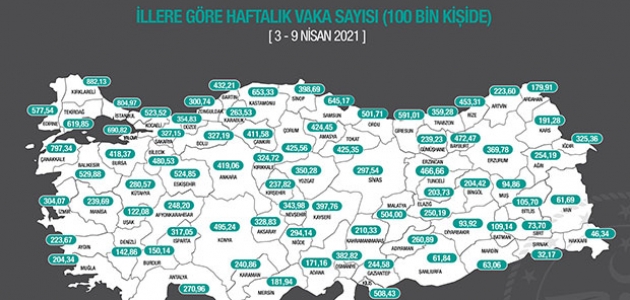 İllerin 3-9 Nisan haftasındaki her 100 bin kişide görülen Kovid-19 vaka sayıları şöyle:
