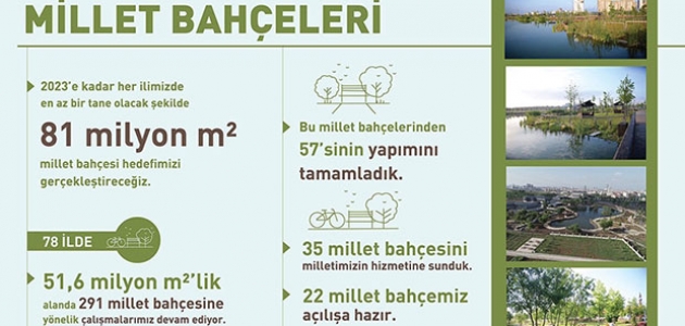 "2023'e kadar her ilimizde en az bir tane olacak şekilde 81 milyon metrekare hedefimizi gerçekleştireceğiz. 78 ilde 51,6 milyon metrekarelik alanda 291 millet bahçesinde çalışmalarımız devam ediyor. 57 millet bahçesini tamamladık. 35 millet bahçesini hizmete sunduk. 22 millet bahçesi açılışa hazır."