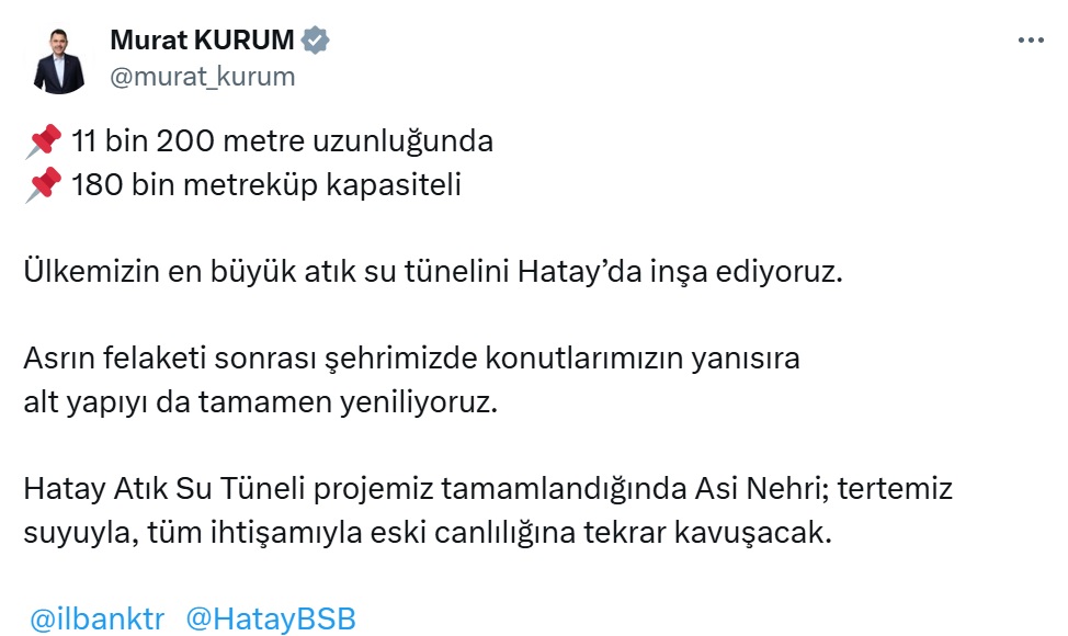 Asrın felaketi sonrası şehrimizde konutlarımızın yanı sıra alt yapıyı da tamamen yeniliyoruz. Hatay Atık Su Tüneli projemiz tamamlandığında Asi Nehri; tertemiz suyuyla, tüm ihtişamıyla eski canlılığına tekrar kavuşacak" ifadelerini kullandı.