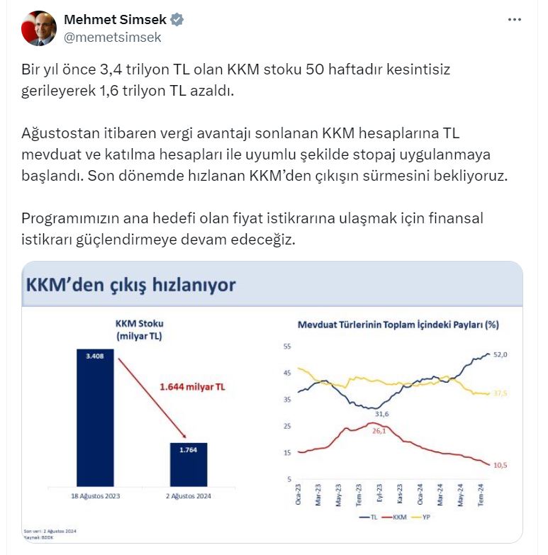 Bakan Mehmet Şimşek, sosyal medya hesabından yaptığı açıklamada, "Bir yıl önce 3,4 trilyon TL olan KKM stoku, 50 haftadır kesintisiz gerileyerek 1,6 trilyon TL azaldı. Ağustostan itibaren vergi avantajı sonlanan KKM hesaplarına TL mevduat ve katılma hesapları ile uyumlu şekilde stopaj uygulanmaya başlandı. Son dönemde hızlanan KKM'den çıkışın sürmesini bekliyoruz. Programımızın ana hedefi olan fiyat istikrarına ulaşmak için finansal istikrarı güçlendirmeye devam edeceğiz" dedi.