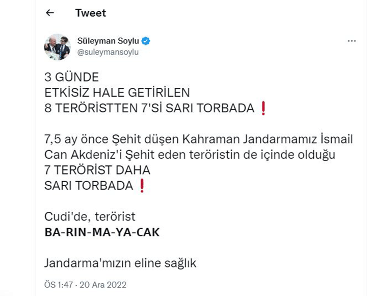 Soylu, Twitter hesabından yaptığı paylaşımda şu ifadeleri kullandı: "3 günde etkisiz hale getirilen 8 teröristten 7'si sarı torbada. 7,5 ay önce Şehit düşen Kahraman Jandarmamız İsmail Can Akdeniz'i Şehit eden teröristin de içinde olduğu 7 terörist daha sarı torbada. Cudi'de, terörist barınamayacak. Jandarma'mızın eline sağlık."