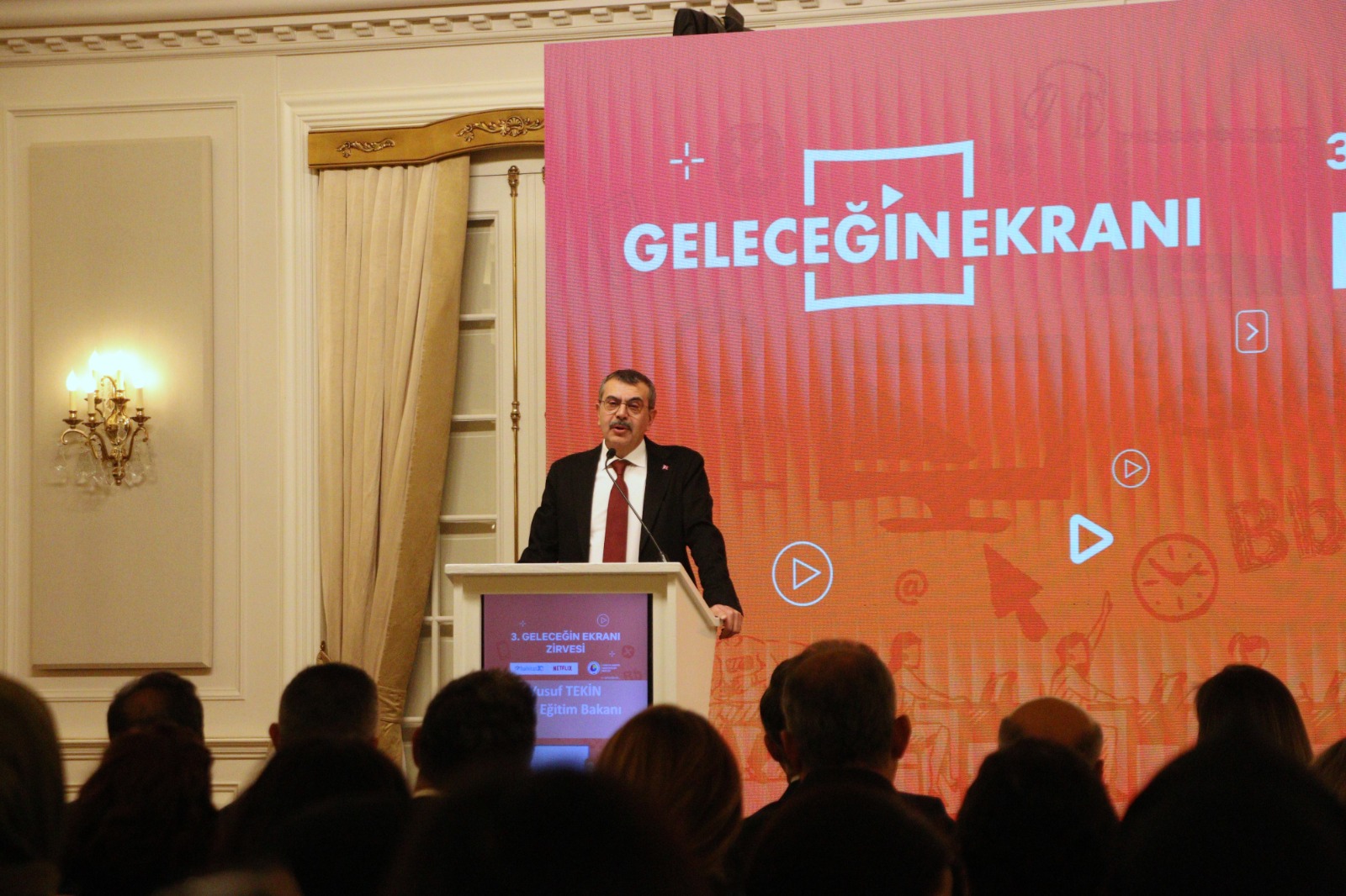 Milli Eğitim Bakanı Yusuf Tekin, Türkiye Odalar ve Borsalar Birliği'nde (TOBB) Netflix, Milletlerarası Ticaret Odası (ICC) Türkiye Milli Komitesi ve Habitat Derneği ortaklığıyla düzenlenen, 'Geleceğin Ekranı Zirvesi'ne katıldı. Programa, Radyo ve Televizyon Üst Kurulu (RTÜK) Başkanı Ebubekir Şahin, TOBB Türkiye Kreatif Endüstriler Meclisi Başkan Yardımcısı Berat Kuzu, Habitat Derneği Genel Başkan Yardımcısı Bora Caldu ve Netflix temsilcileri katıldı. Bakan Tekin, Milli Eğitim Bakanlığı'nda medya okuryazarlığı sürecinin eski Bakan Nabi Avcı döneminde 2013 yılında başlatıldığını belirterek, "'Türkiye Yüzyılı Maarif Modeli' adıyla Türkiye'de 12 yıllık zorunlu eğitim kapsamında ve okul öncesi eğitim kurumlarında uygulanacak müfredatı yeniledik. Bu yenileme çalışmalarımız içerisindeki okuryazarlık türlerinden bir tanesi dijital okuryazarlık. Bir ders olarak değil; ama bütün programların içerisine yedirdiğimiz başlıklardan bir tanesi. Çünkü biz dijital alanda çocuklarımızın yetkinliklerinin de artırılmasını, sadece bir ders bazında değil; bütün hayat becerileri anlamında kazanmasını istiyoruz. 'Türkiye Yüzyılı Maarif Modeli'nin önemli farklılıklarından birisi bu. Sıkça atıfta bulunduğumuz OECD (Ekonomik Kalkınma ve İş Birliği Örgütü) benzeri ya da Birleşmiş Milletler bünyesindeki değişik eğitim ve kültürle ilgilenen, raporlar yazan yapıların altını çizdiği önemli hususlardan bir tanesi şu; klasik anlamda okullar ve öğretmenler eğitim öğretim süreçleri üzerinde maksimum yüzde 50 civarında eğitim öğretim süreçlerinin başarılı olmasını sağlayabilir. Kalan kısımda ana unsur ebeveynler. Ebeveynlerin, ailelerin eğitim öğretim süreçlerine daha proaktif bir biçimde dahil oldukları bir süreci başlatmak istedik" ifadelerini kullandı.