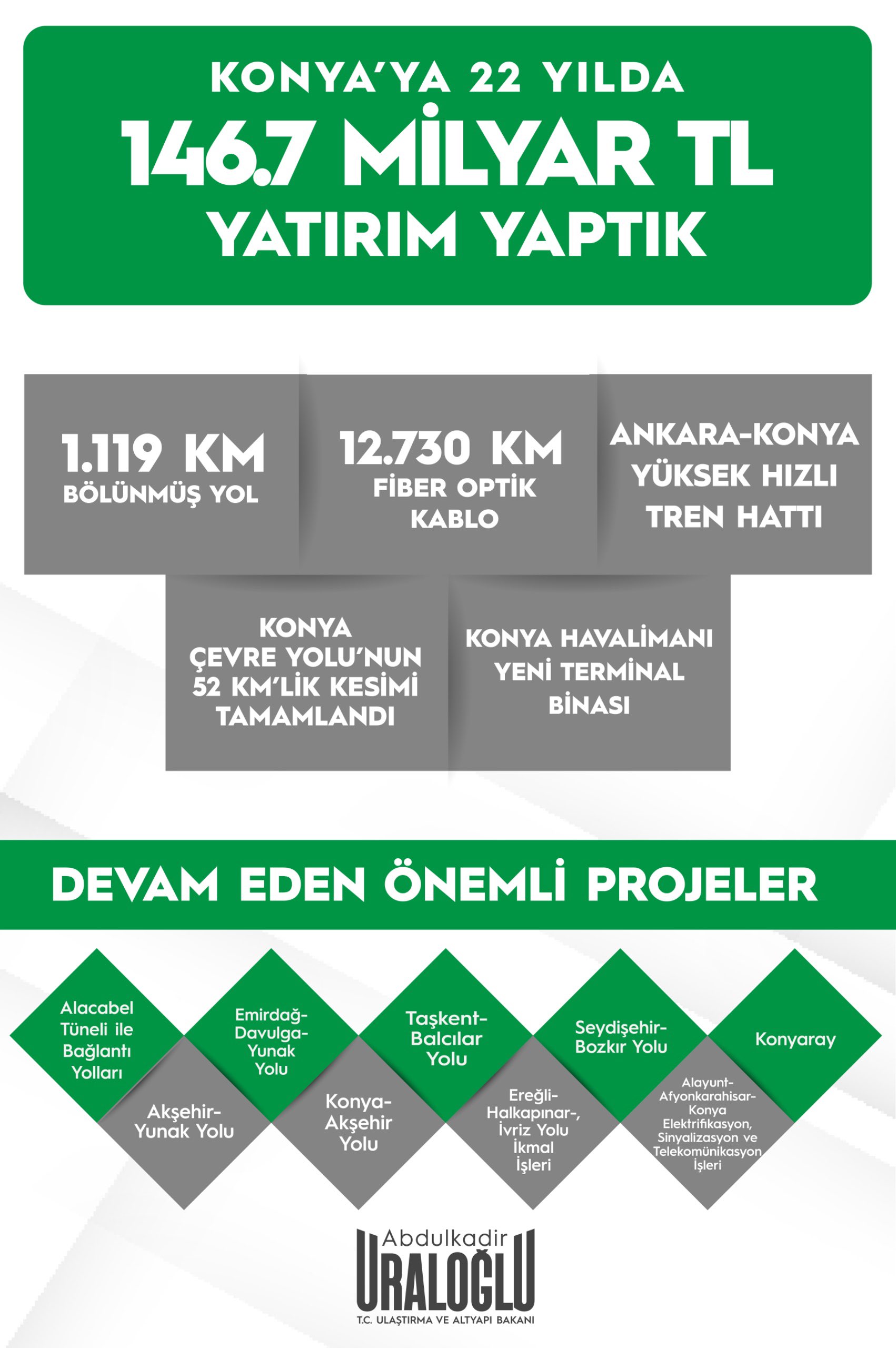 Bakan Uraloğlu sosyal medya hesabından son 22 yılda Konya'ya toplam 146,7 milyar TL'lik yatırım yapıldığını açıkladı ve projelerin detaylarını aktardı.