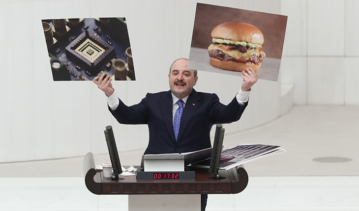 Meclis'te Türkiye'nin teknoloji gündemine değinen Bakan Varank, "Kılıçdaroğlu'nun gezisinden hangi teknoloji ön plana çıktı?" sorusunu yönelterek çip ile hamburger fotoğrafını gösterdi ve "Milletimizin aklında ne kaldı? Hamburger teknolojisi." dedi.