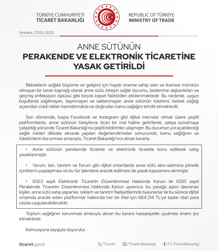 Ticaret Bakanlığı aldığı kararla anne sütünün perakende ticarete ve e-ticarete konu edilerek satışının yasaklandığını duyurdu.