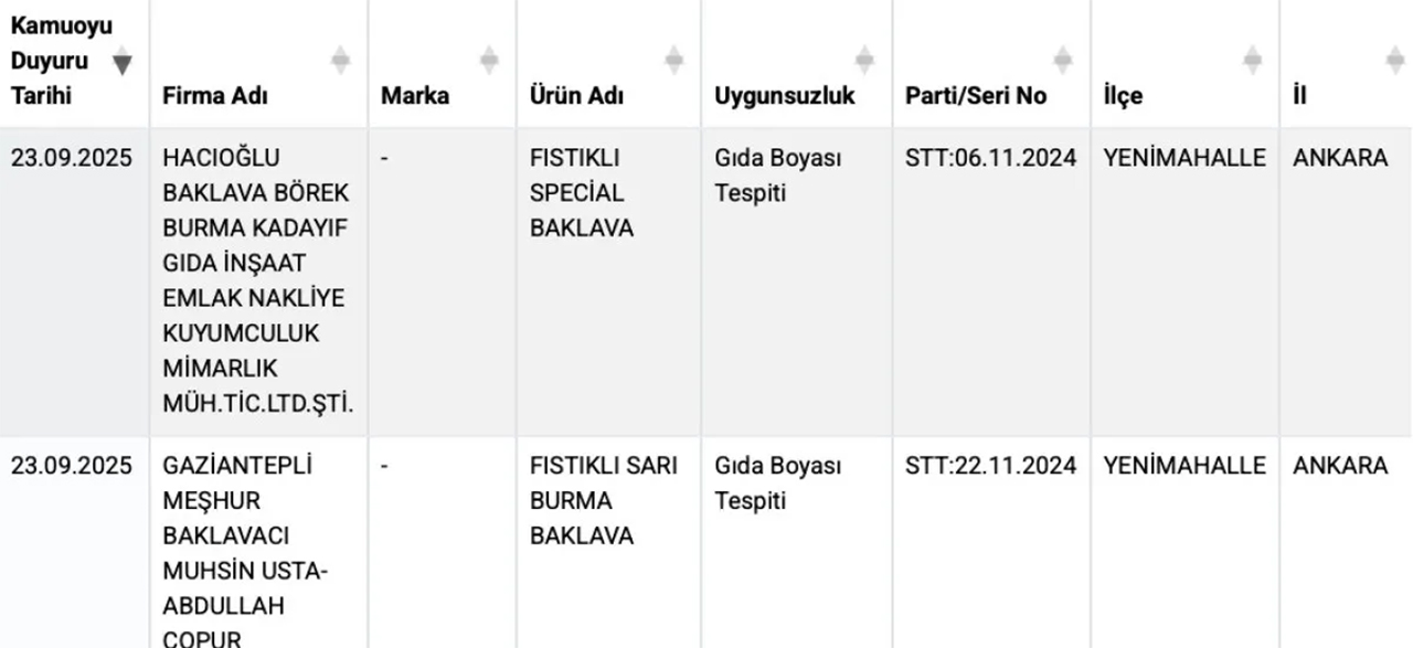 Bu kapsamda, 23 Eylül 2025 tarihinde güncellenen Taklit veya Tağşiş Yapılan Gıdalar listesinde, baklava ürünlerinde uygunsuzluk tespit edilen markalar da yer aldı.