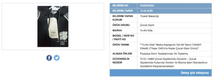 Ticaret Bakanlığı’nın yürüttüğü piyasa denetimleri sonucunda, Yu-Ko Kids markalı bir çocuk giyim ürününün güvenlik standartlarını karşılamadığı belirlendi.