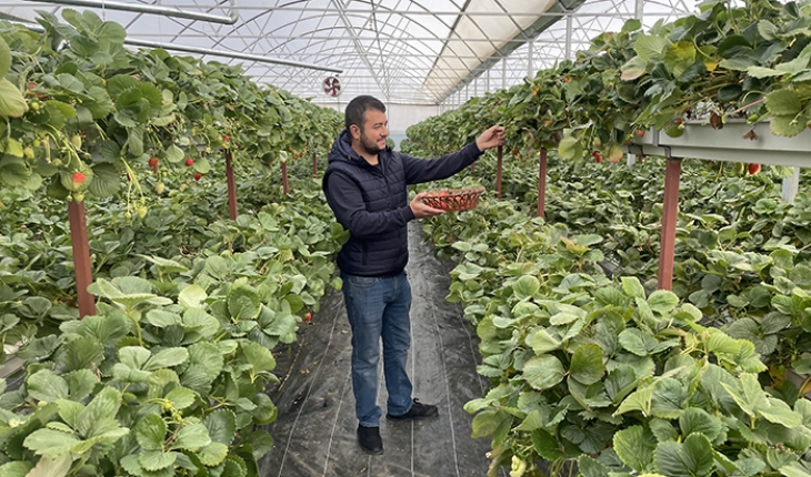 Konya'da özel bir bankada 7 yıl çalıştıktan sonra istifa edip tarıma yönelen Murat Gölkaya, kurduğu serada topraksız tarımla çilek üretiyor.
