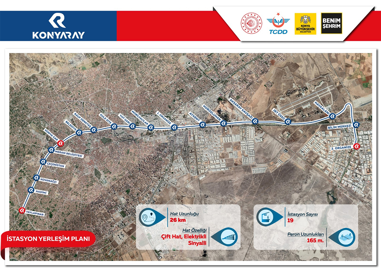 Raylı sistem yatırımlarıyla Konya’nın ulaşım ağını adım adım ördüklerini ve geleceğin şehir ulaşımını inşa ettiklerini ifade eden Başkan Altay, “Konya ulaşımının önemli yatırımlarından KONYARAY’da çalışmalar tüm hızıyla devam ediyor. Konya’ya yapılan önemli ulaşım yatırımlarından biri olan KONYARAY ile ilgili açıklama yapan Konya Büyükşehir Belediye Başkanı Uğur İbrahim Altay, “KONYARAY Banliyö Hattı ile Meram Gar’dan başlayarak; Kültürpark, Selçuklu Gar, Organize Sanayi, Havaalanı ve Aşağıpınarbaşı’na kadar uzanan 23 kilometrelik hattın yapımı aralıksız sürüyor. Havaalanı ilk kez raylı sistemle şehir merkezine bağlanıyor. Durak ve altyapı çalışmaları hızla ilerliyor. Elektrifikasyon ve sinyalizasyon süreci devam ediyor. TCDD ile iş birliği içinde yürütülen bu büyük proje tamamlandığında, Konya’da havaalanından sanayi bölgelerine kadar kesintisiz raylı ulaşım sağlanacak” dedi.