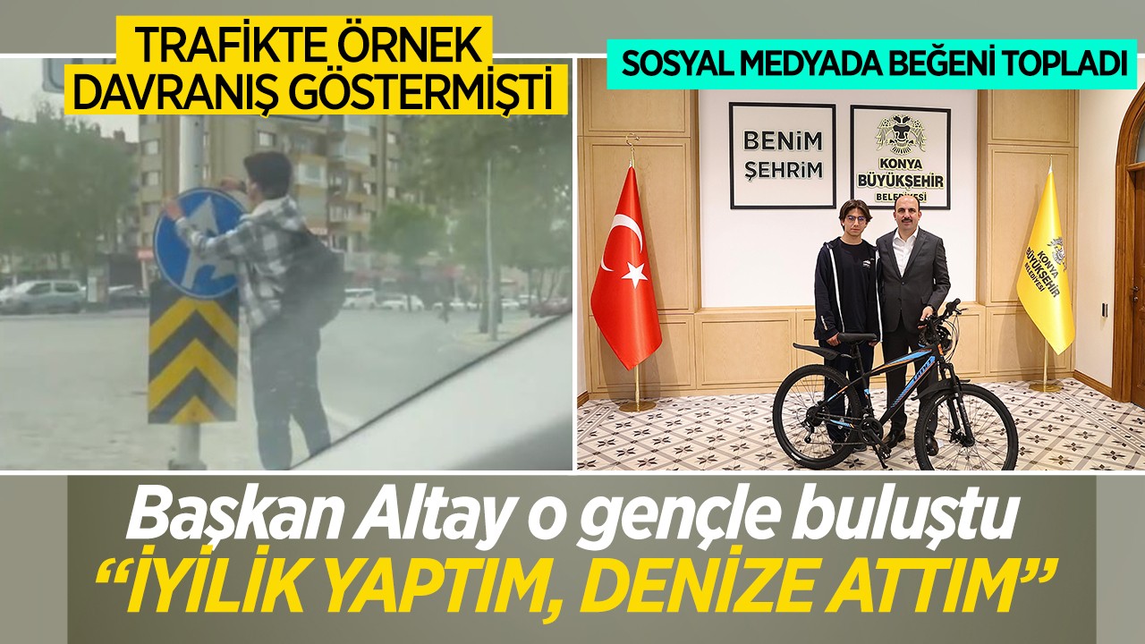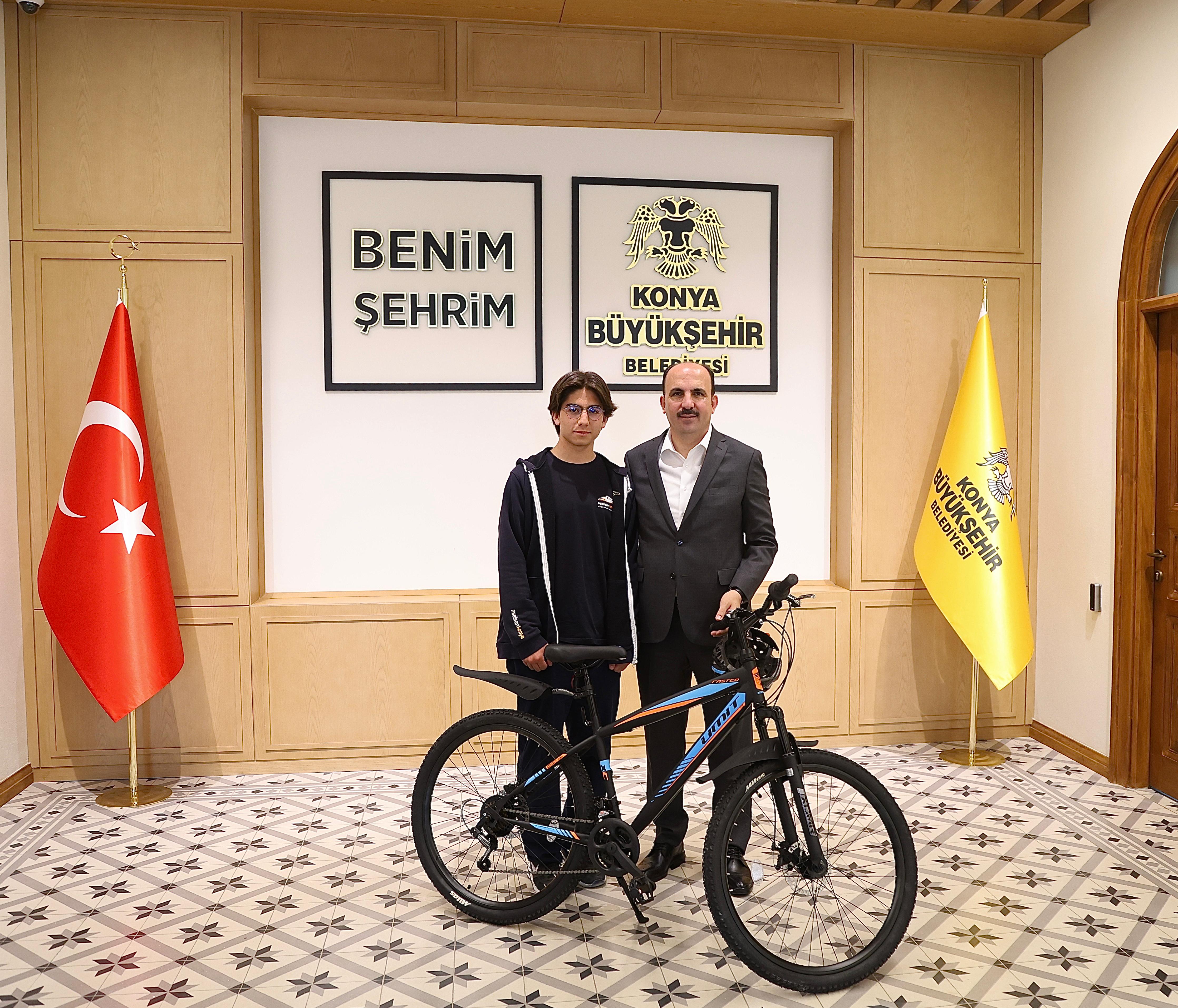 Konya Büyükşehir Belediye Başkanı Uğur İbrahim Altay, ters dönen güzergah tabelasını uzun uğraşlar sonucu düzelten 17 yaşındaki liseli Yusuf Dağtaş’a bisiklet hediye etti.