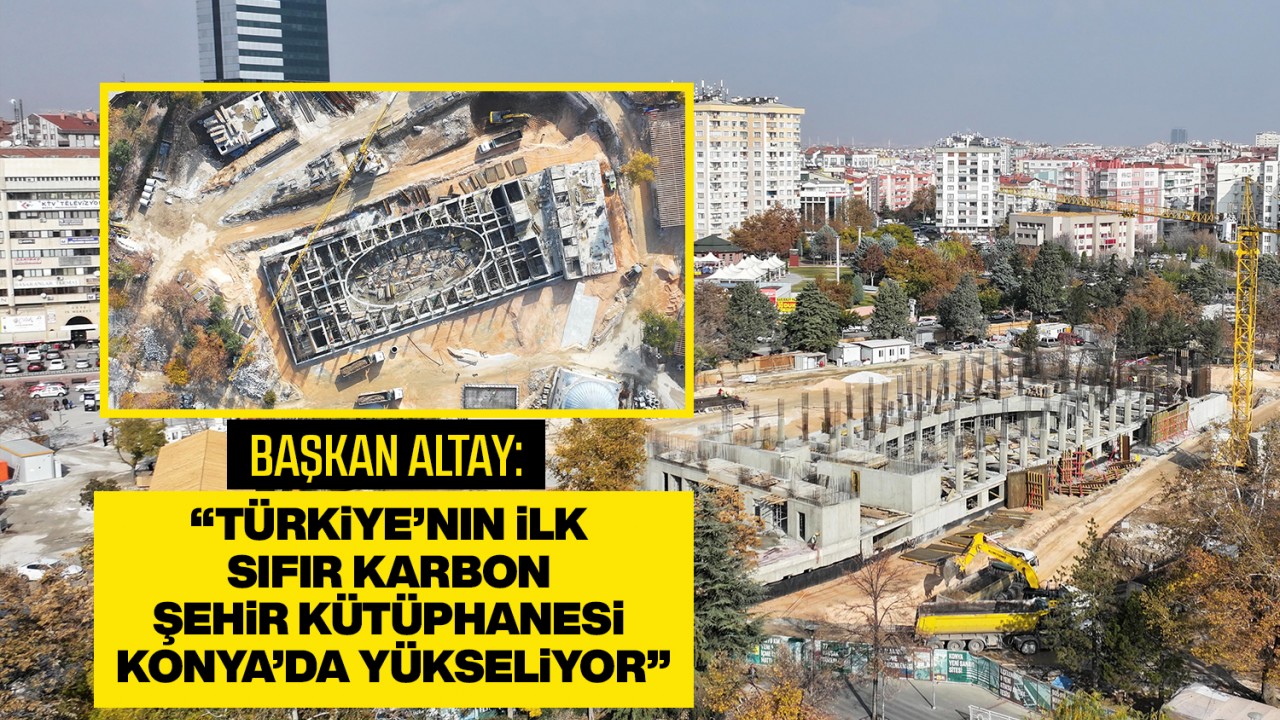 Konya Büyükşehir Belediyesi tarafından eski belediye binasının yerinde inşaatı süren Türkiye’nin ilk Sıfır Karbon binası olma özelliğine sahip Şehir Kütüphanesi hızla yükseliyor. Çevre dostu, yenilikçi ve sürdürülebilir projelere öncelik verdiklerini belirten Konya Büyükşehir Belediye Başkanı Uğur İbrahim Altay, “Bu proje doğaya uyumlu tasarımıyla gelecek nesillere temiz bir çevre bırakma hedefimizin en güzel simgelerinden” dedi. Başkan Altay, “İçerisinde ders çalışma alanlarının, etüt merkezlerinin, dijital kütüphanenin ve büyük kütüphane yapısının olduğu projemiz, Türkiye’nin en güzel yapılarından biri olacak” diye konuştu.