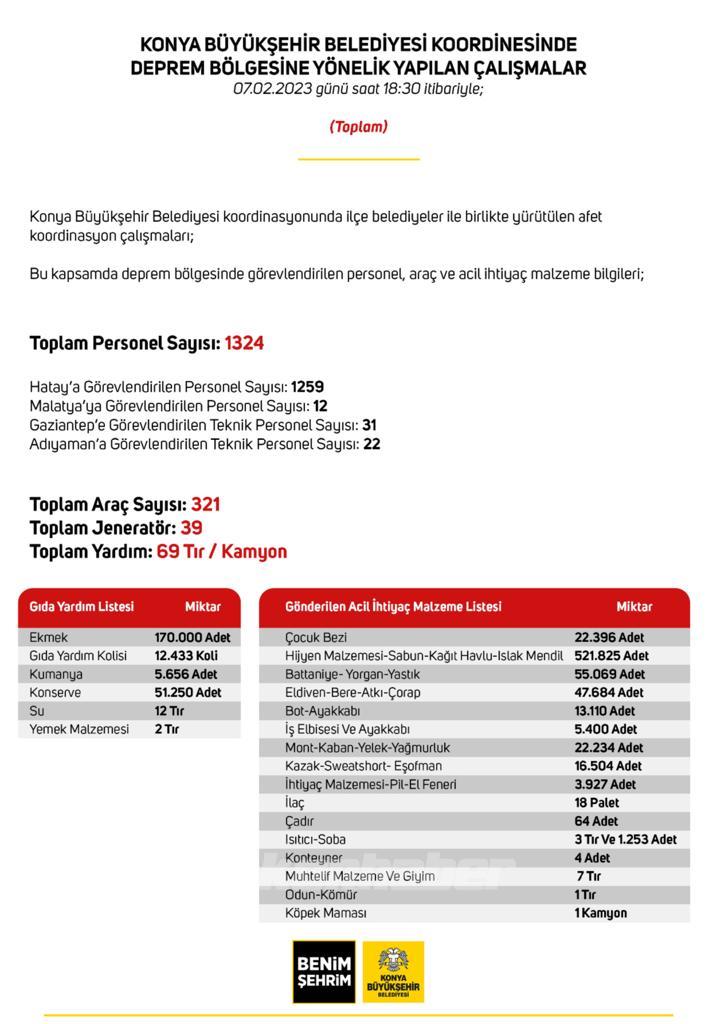 Konya Büyükşehir Belediyesi ve ilçe belediyelerinin Hatay’daki arama kurtarma ve destek çalışmalarına katılan 268 aracı ve 880 personeli bölgede bulunuyor.