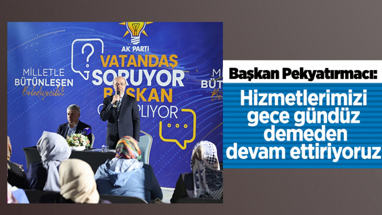 Son dönemde önemli yatırımları tamamladıklarını belirten Başkan Pekyatırmacı, Toplum Ruh Sağlığı ve Sağlıklı Hayat Merkezi’ni tamamladıklarını, Türkiye'nin en büyük sporcu seçme ve yetiştirme merkezinin inşaatına devam ettiklerini ve Türkiye'nin en kapsamlı güzel sanatlar lisesini inşa ettiklerini kaydederek, “Bunlar önemli yatırımlar ve temel belediyecilik hizmetlerinin dışında olan yatırımlar. Belediye olarak tabii ki altyapıdan park bahçelere, çevreye, imara varıncaya kadar çok sayıda görevimiz var. Bunları en iyi şekilde yerine getirmek için gece gündüz demeden çalışıyoruz, gayret ediyoruz. Ama sadece temel belediyecilik hizmetlerini en iyi şekilde yerine getiriyor olmak bizim için yeterli değil. Bunun bilincinde olduğumuz için de her alanda şehrimizin standardını yükseltmek, insanlarımızın yaşam standardını daha yukarıya taşıyabilmek, gençlerimize daha iyi imkanları sunabilmek maksadıyla biz de elimizi taşın altına koyuyoruz ve hangi alanda olursa olsun ihtiyaç olan ne varsa bunları da yapmak, yerine getirmek için gayret ediyoruz. İnşallah bu çabalarımız, gayretlerimiz durmadan, yorulmadan devam edecek. Sizlere hizmet için gecemizi gündüzümüze katarak teşkilatımızla, tüm ekiplerimizle birlikte bu çalışmalarımızı en iyi şekilde yürüteceğiz ve yerine getireceğiz. Tabii bu hizmetleri, bu çalışmaları yaparken her zaman hemşehrilerimizle bir aradayız. Her zaman istişare ediyoruz. Her zaman beklentileri neyse, talepleri neyse bunları en doğru şekilde tespit ederek planlamaları yaparak yatırımlarımızı ona göre yürütüyoruz. Bu manada sizlerle yapacağımız istişareler çok önemli. Sizlerin bize söyleyecekleri öneriler çok önemli. Bu yüzden bu toplantılarımız bizim için çok verimli geçiyor. Tüm mahallelerimizde, ilçemizde yapacağımız hizmetlerle ilgili sizlerin çok değerli katkıları bize yol gösteriyor. Burada olan bu toplantıya iştirak eden tüm hemşerilerimize ayrı ayrı teşekkür ediyorum” diye konuştu.