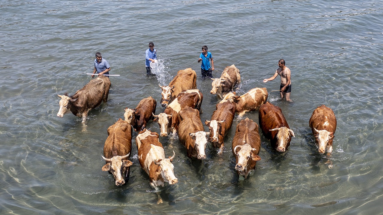 Van'ın Erciş ilçesinde besiciler, havanın ısınmasıyla sıcaktan bunalan büyükbaş hayvanlarını Van Gölü'nde yüzdürüyor.