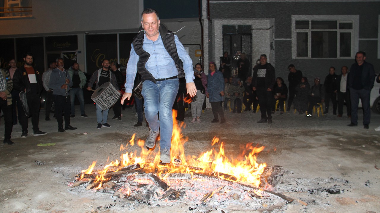 Hacıarmağan Mahallesi meydanında toplananlar, yakılan ateşinin üzerinden atladı, baharın gelişini davul zurna eşliğinde kutladı.