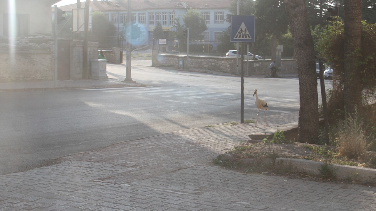 Caddede yürüyen leyleği gören vatandaşlar zabıta ekiplerine haber verdi.