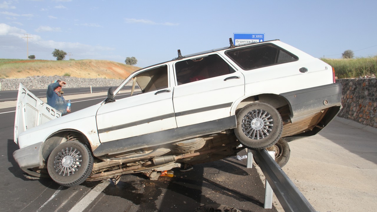 Kazada ön sağ lastiği kopan ve arka tekerlekleri bariyerlerde asılı kalan otomobilin sürücüsü ile araçta bulunan eşi Zehra K. ve 2 yaşındaki kız çocuğu B.K. yaralandı.