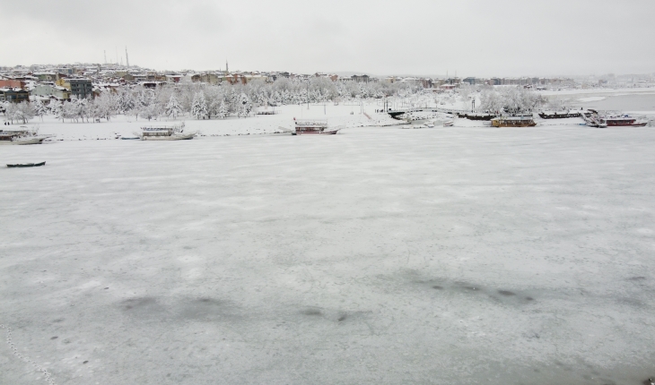 Balıkçılık faaliyetlerinin tamamen durduğu ilçede, balıkçı teknelerini örten brandaların üzeri karla kaplanırken, kıyıda yürüyüş yapmak üzere göl kenarına akın eden vatandaşlar bol bol özçekim yapıyor.